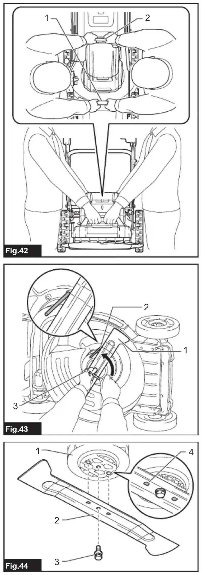 lever, and then release the lever to lock the mulching plug. ► Fig.17: 1. Lever 2. Mulching plug