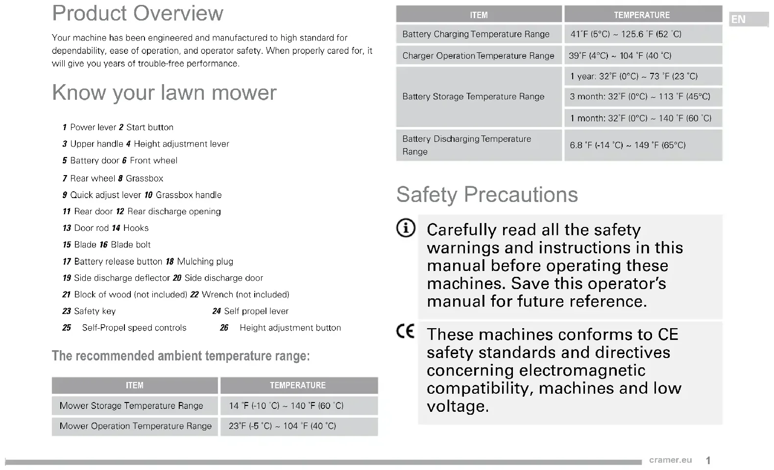 Product Overview Your machine has been engineered and manufactured to high standard for dependability, ease of operation, and operator safety. When properly cared for, it will give you years of trouble-free performance. Know your lawn mower 1 Power lever 2 Start button3 Upper handle 4 Height adjustment lever5 Battery door 6 Front wheel7 Rear wheel 8 Grassbox9 Quick adjust lever 10 Grassbox handle11 Rear door 12 Rear discharge opening13 Door rod 14 Hooks15 Blade 16 Blade bolt17 Battery release button 18 Mulching plug19 Side discharge deflector 20 Side discharge door21 Block of wood (not included) 22 Wrench (not included)23 Safety key 24 Self propel lever 25 Self-Propel speed controls 26 Height adjustment button The recommended ambient temperature range: ITEM TEMPERATUREMower Storage Temperature Range 14 ˚F (-10 ˚C) ~ 140 ˚F (60 ˚C)Mower Operation Temperature Range 23˚F (-5 ˚C) ~ 104 ˚F (40 ˚C)ITEM TEMPERATUREBattery Charging Temperature Range 41˚F (5°C) ~ 125.6 ˚F (52 ˚C) Charger Operation Temperature Range 39˚F (4°C) ~ 104 ˚F (40 ˚C) Battery Storage Temperature Range1 year: 32˚F (0°C) ~ 73 ˚F (23 ˚C)3 month: 32˚F (0°C) ~ 113 ˚F (45°C)1 month: 32˚F (0°C) ~ 140 ˚F (60 ˚C) Battery Discharging Temperature Range6.8 ˚F (-14 ˚C) ~ 149 ˚F (65°C) Safety Precautions Carefully read all the safety warnings and instructions in this manual before operating these machines. Save this operator’s manual for future reference. These machines conforms to CE safety standards and directives concerning electromagnetic compatibility, machines and low voltage.2 cramer.eu