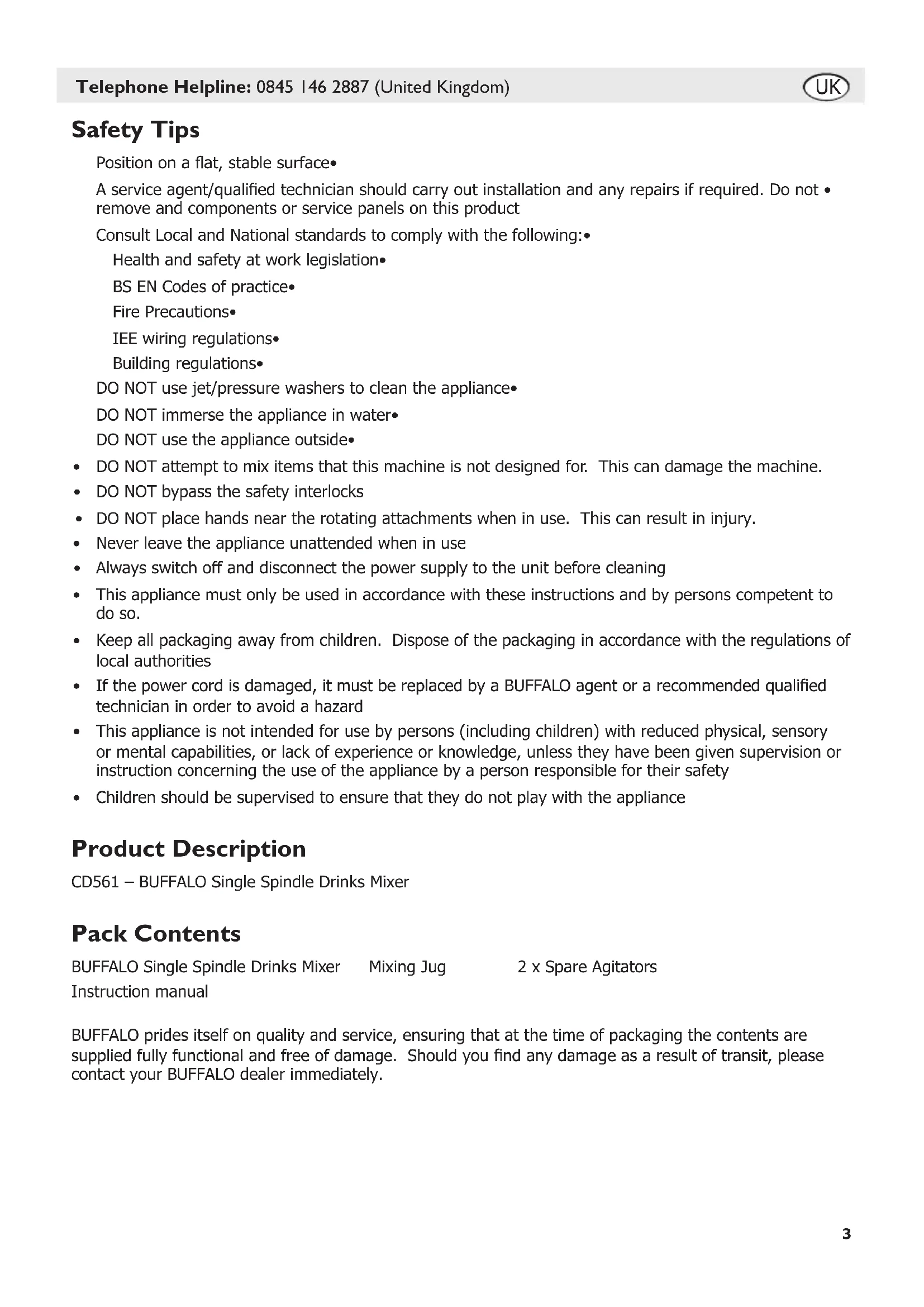Safety Tips Position on a at, stable surface• A service agent/qualied technician should carry out installation and any repairs if required. Do not • remove and components or service panels on this product Consult Local and National standards to comply with the following:• Health and safety at work legislation• BS EN Codes of practice• Fire Precautions• IEE wiring regulations• Building regulations• DO NOT use jet/pressure washers to clean the appliance• DO NOT immerse the appliance in water• DO NOT use the appliance outside• DO NOT attempt to mix items that this machine is not designed for. This can damage the machine.• DO NOT bypass the safety interlocks• DO NOT place hands near the rotating attachments when in use. This can result in injury.• Never leave the appliance unattended when in use • Always switch off and disconnect the power supply to the unit before cleaning• This appliance must only be used in accordance with these instructions and by persons competent to • do so. Keep all packaging away from children. Dispose of the packaging in accordance with the regulations of • local authorities If the power cord is damaged, it must be replaced by a BUFFALO agent or a recommended qualied • technician in order to avoid a hazard This appliance is not intended for use by persons (including children) with reduced physical, sensory • or mental capabilities, or lack of experience or knowledge, unless they have been given supervision or instruction concerning the use of the appliance by a person responsible for their safety Children should be supervised to ensure that they do not play with the appliance• Product Description CD561 – BUFFALO Single Spindle Drinks Mixer Pack Contents BUFFALO Single Spindle Drinks Mixer Mixing Jug 2 x Spare Agitators Instruction manual BUFFALO prides itself on quality and service, ensuring that at the time of packaging the contents are supplied fully functional and free of damage. Should you nd any damage as a result of transit, please contact your BUFFALO dealer immediately.UK