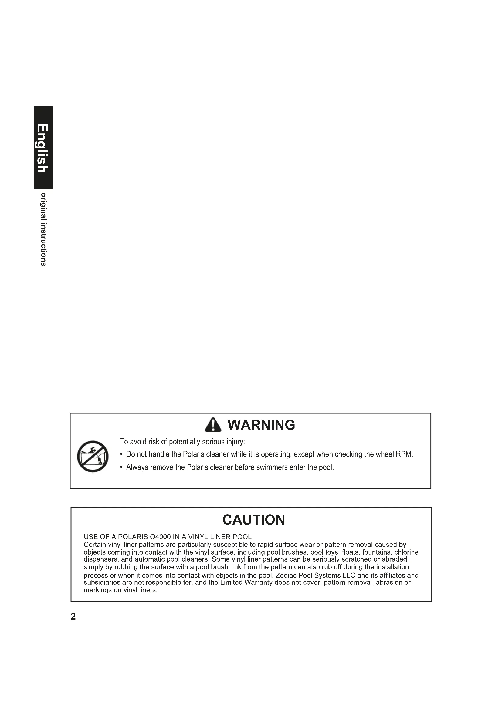 - Always remove the Polaris cleaner before swimmers enter the pool. CAUTION WARNING USE OF A POLARIS Q4000 IN A VINYL LINER POOLCertain vinyl liner patterns are particularly susceptible to rapid surface wear or pattern removal caused by objects coming into contact with the vinyl surface, including pool brushes, pool toys, oats, fountains, chlorine dispensers, and automatic pool cleaners. Some vinyl liner patterns can be seriously scratched or abraded simply by rubbing the surface with a pool brush. Ink from the pattern can also rub off during the installation process or when it comes into contact with objects in the pool. Zodiac Pool Systems LLC and its afliates and subsidiaries are not responsible for, and the Limited Warranty does not cover, pattern removal, abrasion or markings on vinyl liners. original instructionsEnglish