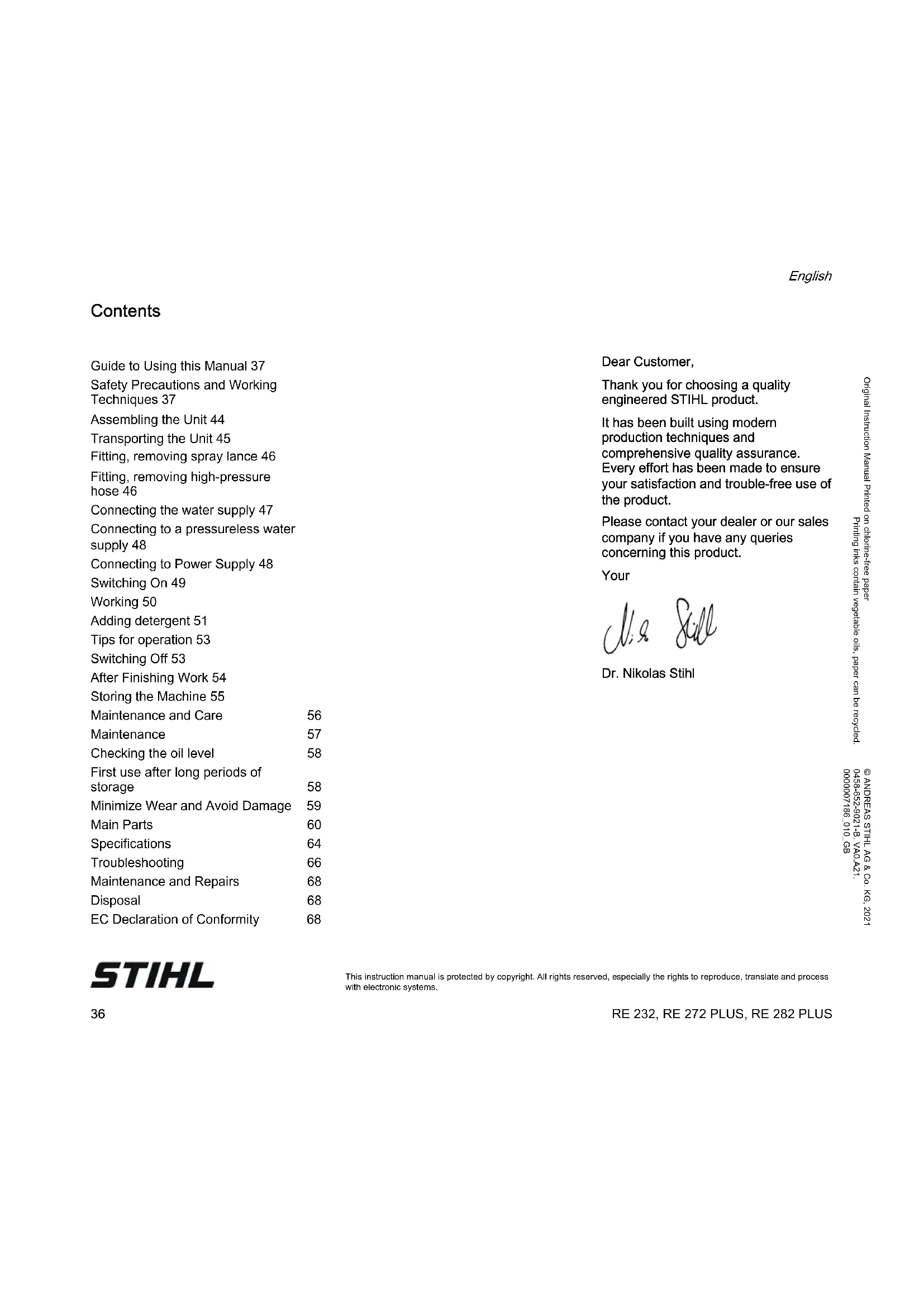 This instruction manual is protected by copyright. All rights reserved, especially the rights to reproduce, translate and process with electronic systems. Contents Dear Customer, Thank you for choosing a quality engineered STIHL product. It has been built using modern production techniques and comprehensive quality assurance. Every effort has been made to ensure your satisfaction and trouble-free use of the product. Please contact your dealer or our sales company if you have any queries concerning this product. Your Dr. Nikolas Stihl Guide to Using this Manual 37 Safety Precautions and Working Techniques 37 Assembling the Unit 44 Transporting the Unit 45 Fitting, removing spray lance 46 Fitting, removing high-pressure hose 46 Connecting the water supply 47 Connecting to a pressureless water supply 48 Connecting to Power Supply 48 Switching On 49 Working 50 Adding detergent 51 Tips for operation 53 Switching Off 53 After Finishing Work 54 Storing the Machine 55 Maintenance and Care 56 Maintenance 57 Checking the oil level 58 First use after long periods of storage 58 Minimize Wear and Avoid Damage 59 Main Parts 60 Specifications 64 Troubleshooting 66 Maintenance and Repairs 68 Disposal 68 EC Declaration of Conformity 68RE 232, RE 272 PLUS, RE 282 PLUS English