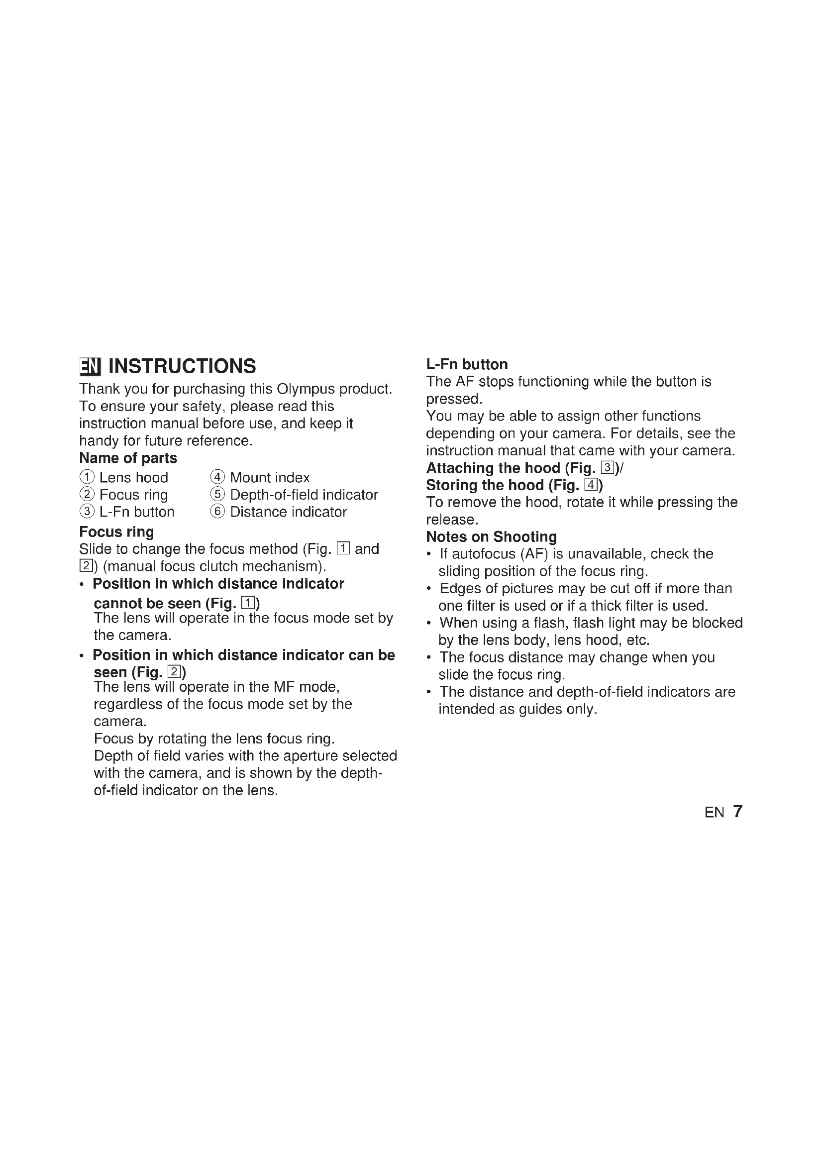 http://www.olympus.co.jp/en/support/imsg/ digicamera/download/notice/notice.cfmEN 7 INSTRUCTIONS Thank you for purchasing this Olympus product. To ensure your safety, please read this instruction manual before use, and keep it handy for future reference. Name of parts 1 Lens hood 2 Focus ring 3 L-Fn button 4 Mount index 5 Depth-of-field indicator 6 Distance indicator Focus ring Slide to change the focus method (Fig. 1 and