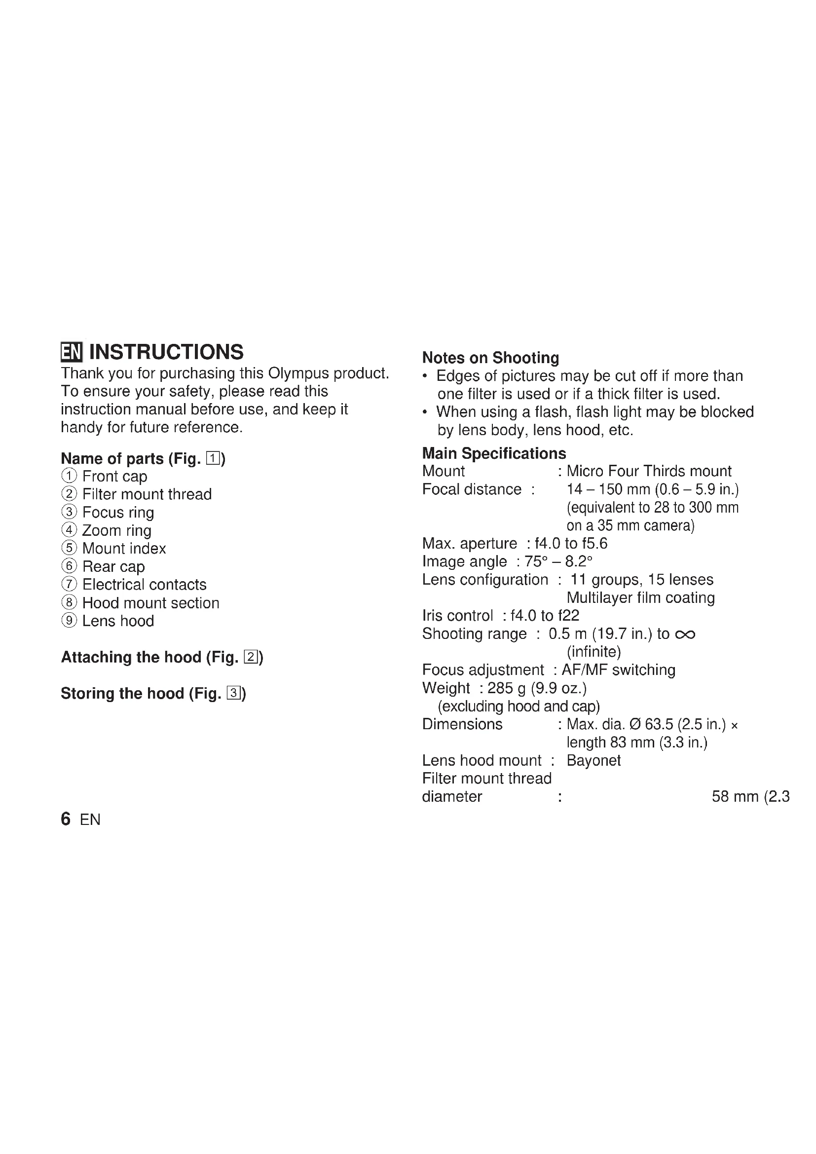 - When using a flash, flash light may be blocked by lens body, lens hood, etc. Main Specifications Mount : Micro Four Thirds mount Focal distance : 14 – 150 mm (0.6 – 5.9 in.) (equivalent to 28 to 300 mm on a 35 mm camera) Max. aperture : f4.0 to f5.6 Image angle : 75° – 8.2° Lens configuration : 11 groups, 15 lenses Multilayer film coating Iris control : f4.0 to f22 Shooting range : 0.5 m (19.7 in.) to ) (infinite) Focus adjustment : AF/MF switching Weight : 285 g (9.9 oz.) (excluding hood and cap) Dimensions : Max. dia. Ø 63.5 (2.5 in.) × length 83 mm (3.3 in.) Lens hood mount : Bayonet Filter mount thread diameter : 58 mm (2.3 in.) ENEN 7