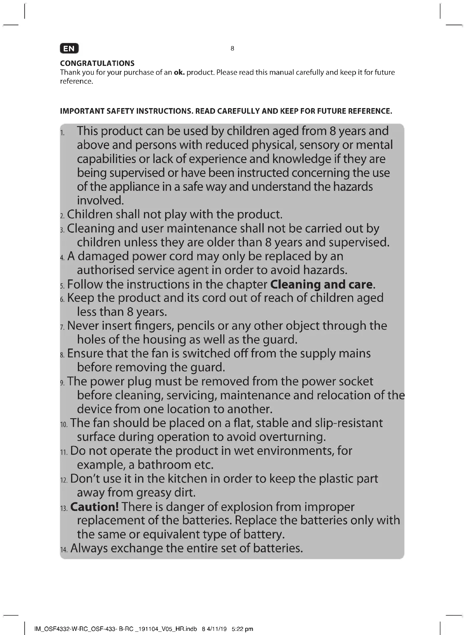 CONGRATULATIONS Thank you for your purchase of an ok. product. Please read this manual carefully and keep it for future reference. IMPORTANT SAFETY INSTRUCTIONS. READ CAREFULLY AND KEEP FOR FUTURE REFERENCE.