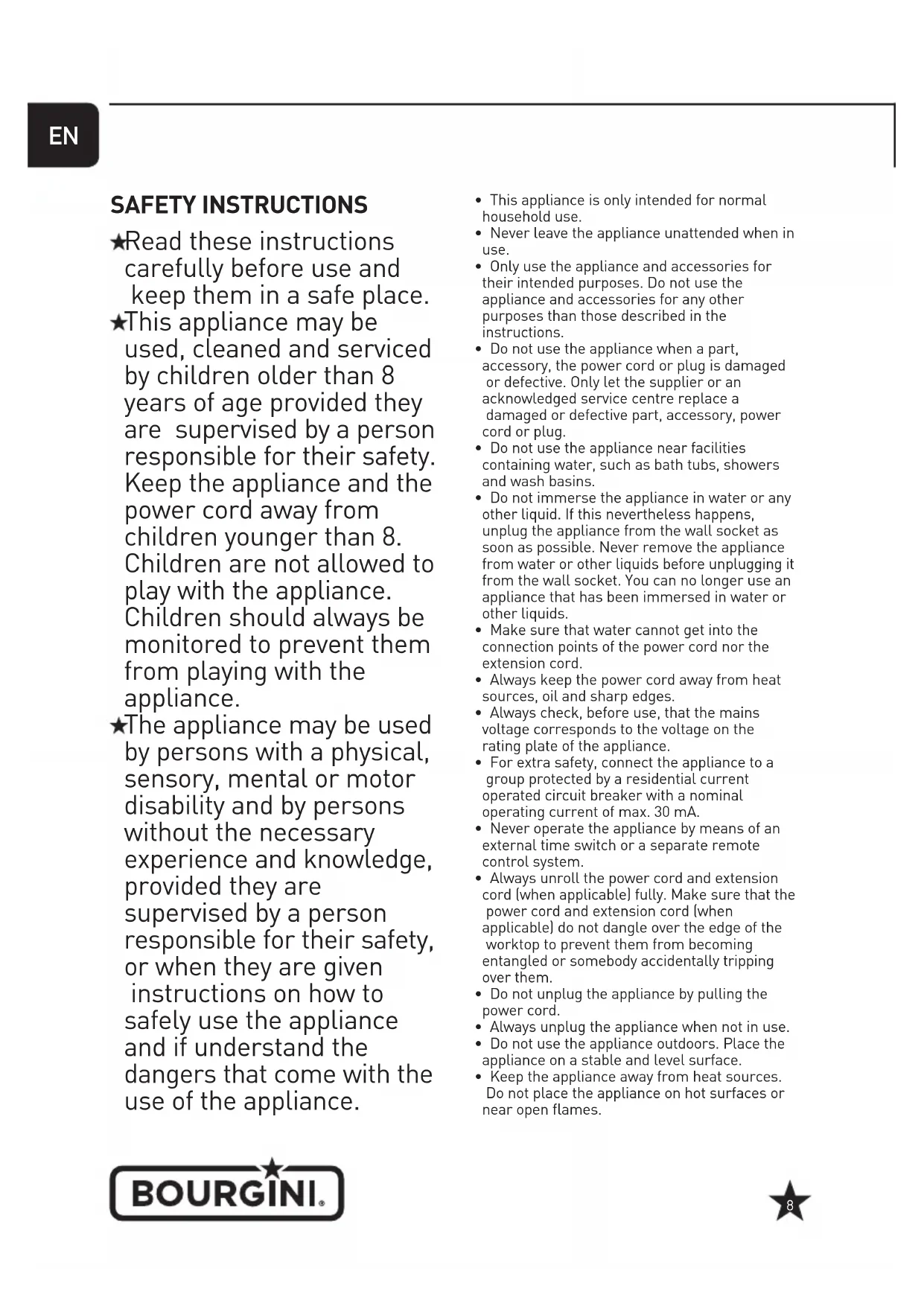The warranty is valid for a period of 2 years from the date of purchase as stated on your purchase receipt, which also your proof of warranty. Please turn to your retailer to claim your warranty. The warranty shall not apply if the product is subjected to incorrect use,, improperly disassembled, damaged by falls, impacts or similar, or if damage is caused due to failure to descale in good time products that are manufactured for use with water. Should a certain product be provided with specific warranty terms and conditions, these shall receive priority over general terms and conditions. The warranty shall not apply to indirect damages. Should you have any questions regarding the use of the product, please consult our website at www.bourgini.com DISCLAIMER Changes reserved; specifications are subject to change without stating grounds for doing so.