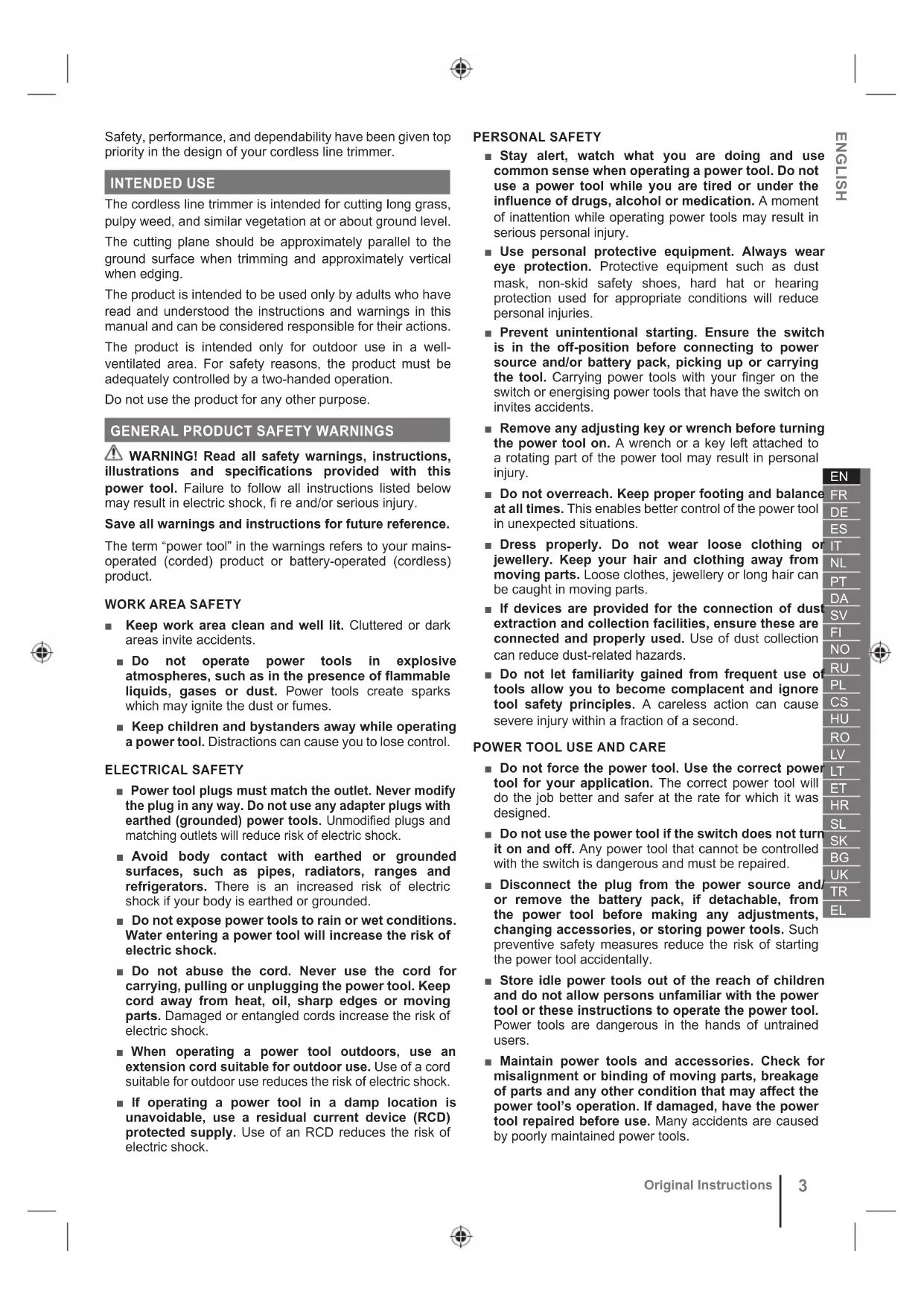 Original Instructions Safety, performance, and dependability have been given top priority in the design of your cordless line trimmer. INTENDED USE The cordless line trimmer is intended for cutting long grass, pulpy weed, and similar vegetation at or about ground level. The cutting plane should be approximately parallel to the ground surface when trimming and approximately vertical when edging. The product is intended to be used only by adults who have read and understood the instructions and warnings in this manual and can be considered responsible for their actions. The product is intended only for outdoor use in a well- ventilated area. For safety reasons, the product must be adequately controlled by a two-handed operation. Do not use the product for any other purpose.