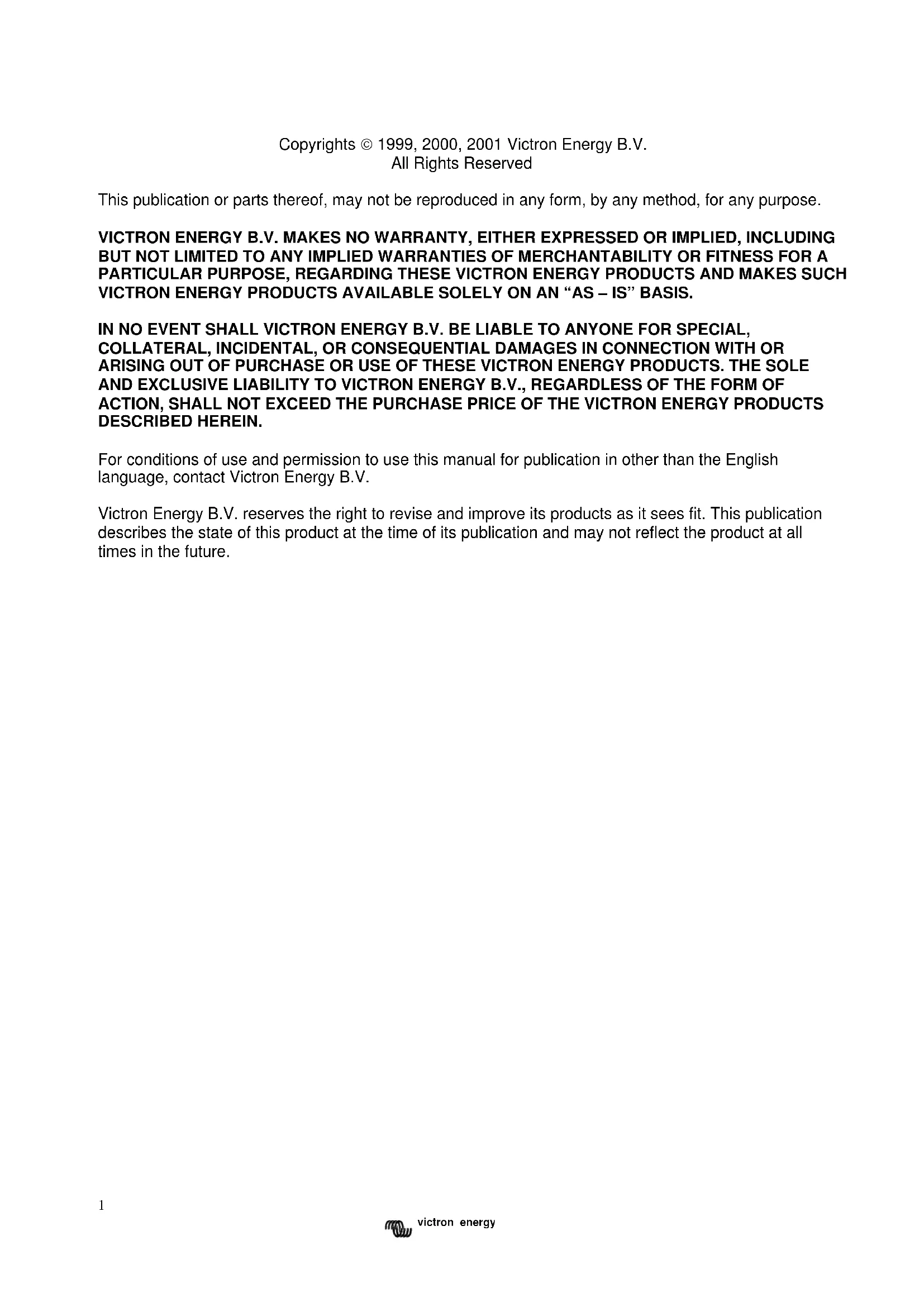 Copyrights 1999, 2000, 2001 Victron Energy B.V. All Rights Reserved This publication or parts thereof, may not be reproduced in any form, by any method, for any purpose. VICTRON ENERGY B.V. MAKES NO WARRANTY, EITHER EXPRESSED OR IMPLIED, INCLUDING BUT NOT LIMITED TO ANY IMPLIED WARRANTIES OF MERCHANTABILITY OR FITNESS FOR A PARTICULAR PURPOSE, REGARDING THESE VICTRON ENERGY PRODUCTS AND MAKES SUCH VICTRON ENERGY PRODUCTS AVAILABLE SOLELY ON AN “AS – IS” BASIS. IN NO EVENT SHALL VICTRON ENERGY B.V. BE LIABLE TO ANYONE FOR SPECIAL, COLLATERAL, INCIDENTAL, OR CONSEQUENTIAL DAMAGES IN CONNECTION WITH OR ARISING OUT OF PURCHASE OR USE OF THESE VICTRON ENERGY PRODUCTS. THE SOLE AND EXCLUSIVE LIABILITY TO VICTRON ENERGY B.V., REGARDLESS OF THE FORM OF ACTION, SHALL NOT EXCEED THE PURCHASE PRICE OF THE VICTRON ENERGY PRODUCTS DESCRIBED HEREIN. For conditions of use and permission to use this manual for publication in other than the English language, contact Victron Energy B.V. Victron Energy B.V. reserves the right to revise and improve its products as it sees fit. This publication describes the state of this product at the time of its publication and may not reflect the product at all times in the future.2 victron energy GB NL F D I DK ΕΛ N P E S Specs