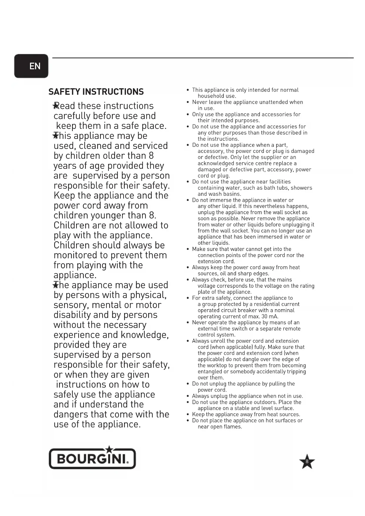 SAFETY INSTRUCTIONS Read these instructions carefully before use and keep them in a safe place. This appliance may be used, cleaned and serviced by children older than 8 years of age provided they are supervised by a person responsible for their safety. Keep the appliance and the power cord away from children younger than 8. Children are not allowed to play with the appliance. Children should always be monitored to prevent them from playing with the appliance. The appliance may be used by persons with a physical, sensory, mental or motor disability and by persons without the necessary experience and knowledge, provided they are supervised by a person responsible for their safety, or when they are given instructions on how to safely use the appliance and if understand the dangers that come with the use of the appliance.