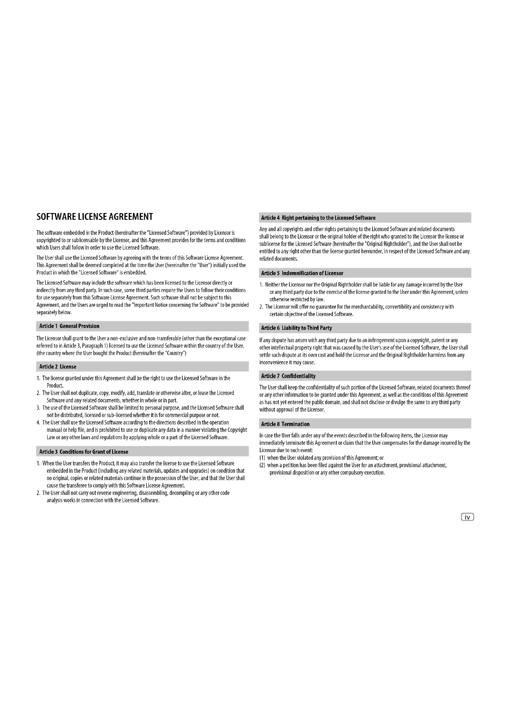 The software embedded in the Product (hereinafter the "Licensed Software") provided by Licensor is copyrighted to or sublicensable by the Licensor, and this Agreement provides for the terms and conditions which Users shall follow in order to use the Licensed Software. The User shall use the Licensed Software by agreeing with the terms of this Software License Agreement. This Agreement shall be deemed completed at the time the User (hereinafter the "User") initially used the Product in which the "Licensed Software" is embedded. The Licensed Software may include the software which has been licensed to the Licensor directly or indirectly from any third party. In such case, some third parties require the Users to follow their conditions for use separately from this Software License Agreement. Such software shall not be subject to this Agreement, and the Users are urged to read the "Important Notice concerning the Software" to be provided separately below. Article 1 General Provision The Licensor shall grant to the User a non-exclusive and non-transferable (other than the exceptional case referred to in Article 3, Paragraph 1) licensed to use the Licensed Software within the country of the User. (the country where the User bought the Product (hereinafter the "Country") Article 2 License