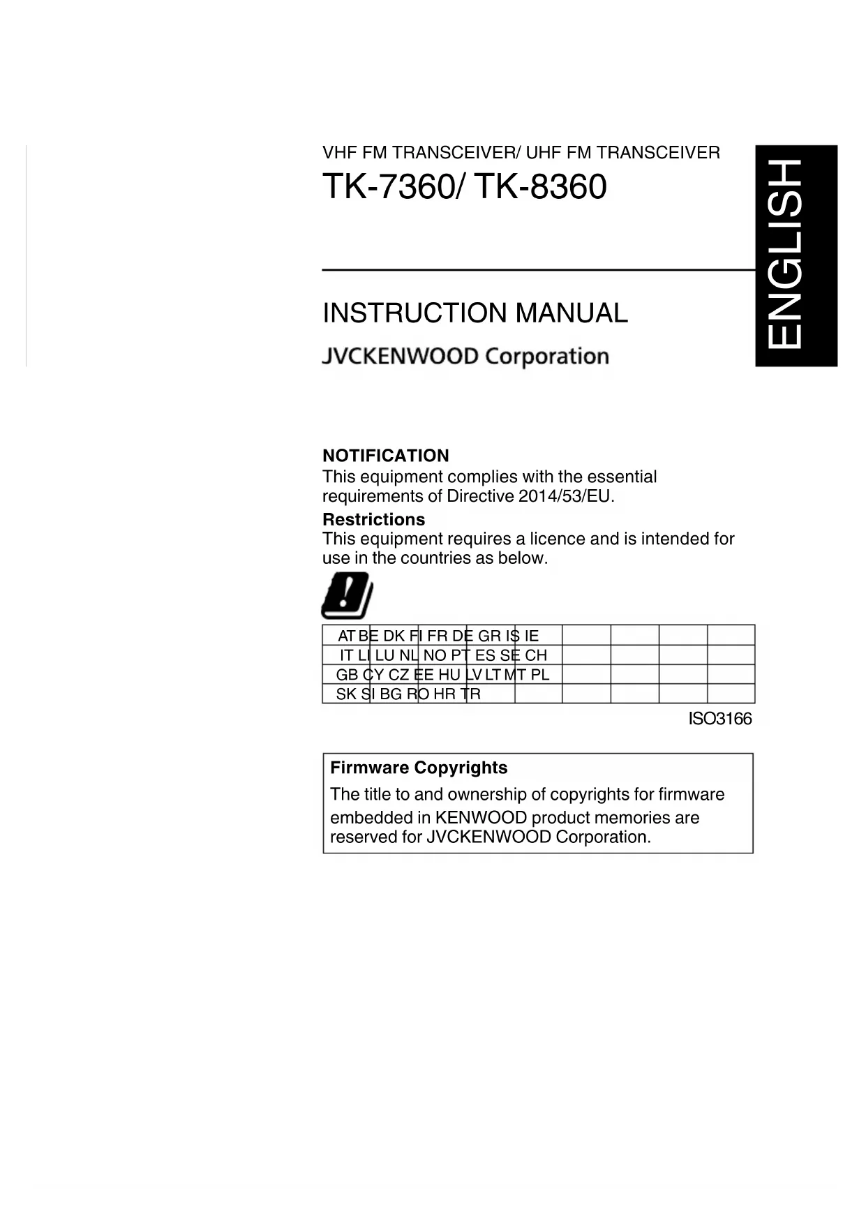 ΟΔΗΓΙΕΣ ΧΡΗΣΗΣ B62-2282-40 (E)VHF FM TRANSCEIVER/ UHF FM TRANSCEIVER TK-7360/ TK-8360 INSTRUCTION MANUAL ENGLISH NOTIFICATION This equipment complies with the essential requirements of Directive 2014/53/EU. Restrictions This equipment requires a licence and is intended for use in the countries as below. AT BE DK FI FR DE GR IS IE IT LI LU NL NO PT ES SE CH GB CY CZ EE HU LV LT MT PL SK SI BG RO HR TR ISO3166 Firmware Copyrights The title to and ownership of copyrights for rmware embedded in KENWOOD product memories are reserved for JVCKENWOOD Corporation.Information on Disposal of Old Electrical and Electronic Equipment and Batteries (applicable for countries that have adopted separate waste collection systems) Products and batteries with the symbol (crossed-out wheeled bin) cannot be disposed as household waste. Old electrical and electronic equipment and batteries should be recycled at a facility capable of handling these items and their waste byproducts. Contact your local authority for details in locating a recycle facility nearest to you. Proper recycling and waste disposal will help conserve resources whilst preventing detrimental effects on our health and the environment.i THANK YOU We are grateful you have chosen KENWOOD for your personal mobile applications. This instruction manual covers only the basic operations of your mobile radio. Ask your dealer for information on any customized features they may have added to your radio.