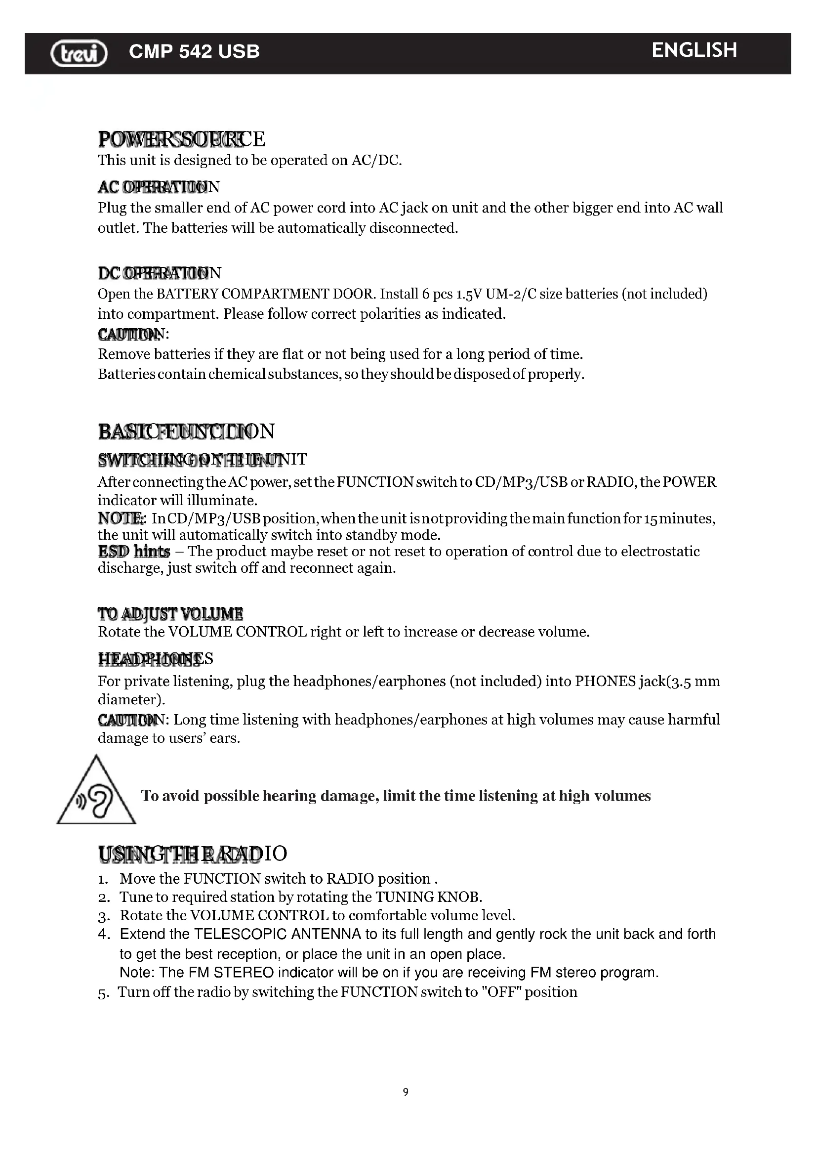 After connecting the AC power, set the FUNCTION switch to CD/MP3/USB or RADIO, the POWER indicator will illuminate. NOTE: In CD/MP3/USB position, when the unit is not providing the main function for 15 minutes, the unit will automatically switch into standby mode. ESD hints – The product maybe reset or not reset to operation of control due to electrostatic discharge, just switch off and reconnect again. Rotate the VOLUME CONTROL right or left to increase or decrease volume. HEADPHONES For private listening, plug the headphones/earphones (not included) into PHONES jack(3.5 mm diameter). CAUTION: Long time listening with headphones/earphones at high volumes may cause harmful damage to users’ ears. To avoid possible hearing damage, limit the time listening at high volumes