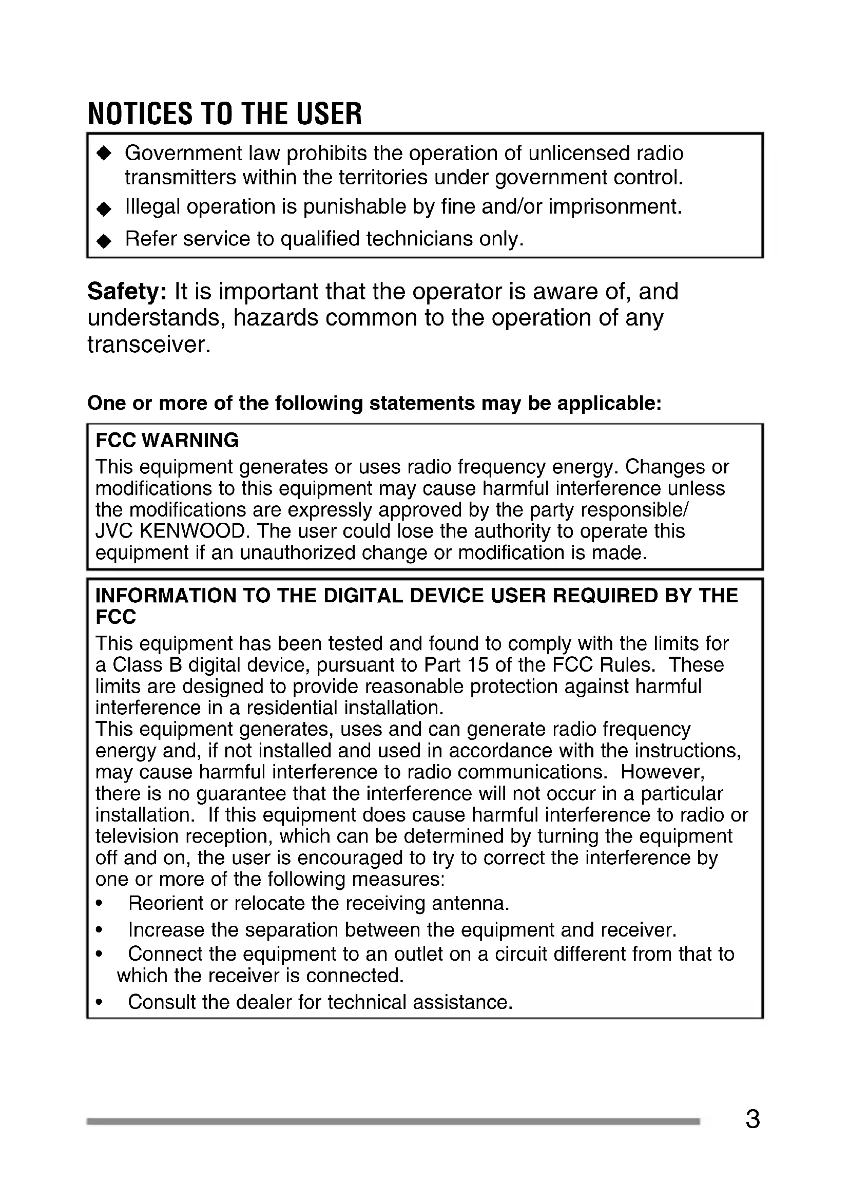Refer service to qualified technicians only. Safety: It is important that the operator is aware of, and understands, hazards common to the operation of any transceiver. One or more of the following statements may be applicable: FCC WARNING This equipment generates or uses radio frequency energy. Changes or modifications to this equipment may cause harmful interference unless the modifications are expressly approved by the party responsible/ JVC KENWOOD. The user could lose the authority to operate this equipment if an unauthorized change or modification is made. INFORMATION TO THE DIGITAL DEVICE USER REQUIRED BY THE FCC This equipment has been tested and found to comply with the limits for a Class B digital device, pursuant to Part 15 of the FCC Rules. These limits are designed to provide reasonable protection against harmful interference in a residential installation. This equipment generates, uses and can generate radio frequency energy and, if not installed and used in accordance with the instructions, may cause harmful interference to radio communications. However, there is no guarantee that the interference will not occur in a particular installation. If this equipment does cause harmful interference to radio or television reception, which can be determined by turning the equipment off and on, the user is encouraged to try to correct the interference by one or more of the following measures: