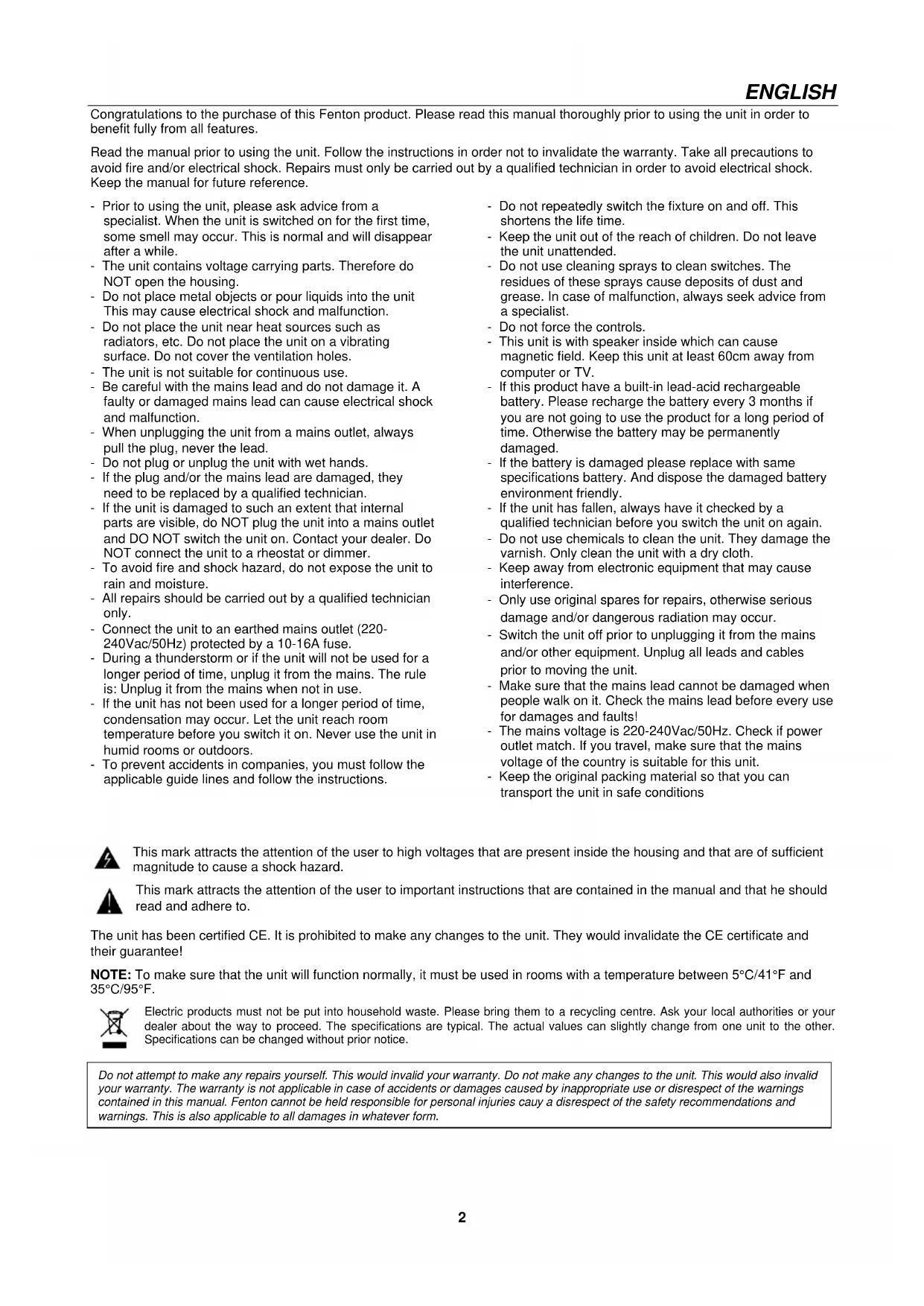 V1.22 ENGLISH Congratulations to the purchase of this Fenton product. Please read this manual thoroughly prior to using the unit in order to benefit fully from all features. Read the manual prior to using the unit. Follow the instructions in order not to invalidate the warranty. Take all precautions to avoid fire and/or electrical shock. Repairs must only be carried out by a qualified technician in order to avoid electrical shock. Keep the manual for future reference. - Prior to using the unit, please ask advice from a specialist. When the unit is switched on for the first time, some smell may occur. This is normal and will disappear after a while. - The unit contains voltage carrying parts. Therefore do NOT open the housing. - Do not place metal objects or pour liquids into the unit This may cause electrical shock and malfunction. - Do not place the unit near heat sources such as radiators, etc. Do not place the unit on a vibrating surface. Do not cover the ventilation holes. - The unit is not suitable for continuous use. - Be careful with the mains lead and do not damage it. A faulty or damaged mains lead can cause electrical shock and malfunction. - When unplugging the unit from a mains outlet, always pull the plug, never the lead. - Do not plug or unplug the unit with wet hands. - If the plug and/or the mains lead are damaged, they need to be replaced by a qualified technician. - If the unit is damaged to such an extent that internal parts are visible, do NOT plug the unit into a mains outlet and DO NOT switch the unit on. Contact your dealer. Do NOT connect the unit to a rheostat or dimmer. - To avoid fire and shock hazard, do not expose the unit to rain and moisture. - All repairs should be carried out by a qualified technician only. - Connect the unit to an earthed mains outlet (220- 240Vac/50Hz) protected by a 10-16A fuse. - During a thunderstorm or if the unit will not be used for a longer period of time, unplug it from the mains. The rule is: Unplug it from the mains when not in use. - If the unit has not been used for a longer period of time, condensation may occur. Let the unit reach room temperature before you switch it on. Never use the unit in humid rooms or outdoors. - To prevent accidents in companies, you must follow the applicable guide lines and follow the instructions. - Do not repeatedly switch the fixture on and off. This shortens the life time. - Keep the unit out of the reach of children. Do not leave the unit unattended. - Do not use cleaning sprays to clean switches. The residues of these sprays cause deposits of dust and grease. In case of malfunction, always seek advice from a specialist. - Do not force the controls. - This unit is with speaker inside which can cause magnetic field. Keep this unit at least 60cm away from computer or TV. - If this product have a built-in lead-acid rechargeable battery. Please recharge the battery every 3 months if you are not going to use the product for a long period of time. Otherwise the battery may be permanently damaged. - If the battery is damaged please replace with same specifications battery. And dispose the damaged battery environment friendly. - If the unit has fallen, always have it checked by a qualified technician before you switch the unit on again. - Do not use chemicals to clean the unit. They damage the varnish. Only clean the unit with a dry cloth. - Keep away from electronic equipment that may cause interference. - Only use original spares for repairs, otherwise serious damage and/or dangerous radiation may occur. - Switch the unit off prior to unplugging it from the mains and/or other equipment. Unplug all leads and cables prior to moving the unit. - Make sure that the mains lead cannot be damaged when people walk on it. Check the mains lead before every use for damages and faults! - The mains voltage is 220-240Vac/50Hz. Check if power outlet match. If you travel, make sure that the mains voltage of the country is suitable for this unit. - Keep the original packing material so that you can transport the unit in safe conditions