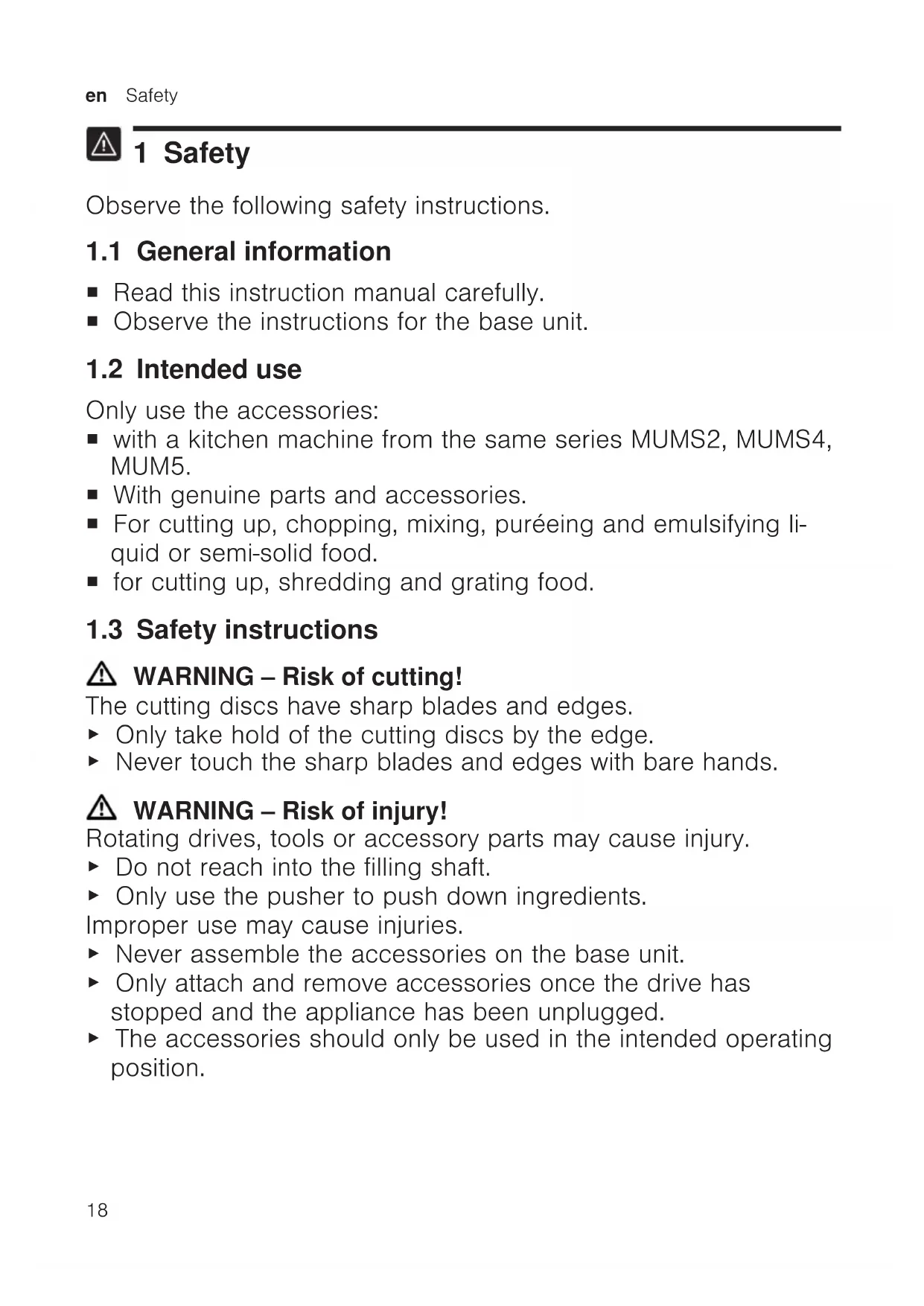 1 Safety Observe the following safety instructions. 1.1 General information ¡ Read this instruction manual carefully. ¡ Observe the instructions for the base unit. 1.2 Intended use Only use the accessories: ¡ with a kitchen machine from the same series MUMS2, MUMS4, MUM5. ¡ With genuine parts and accessories. ¡ For cutting up, chopping, mixing, puréeing and emulsifying li- quid or semi-solid food. ¡ for cutting up, shredding and grating food. 1.3 Safety instructions WARNING‒Risk of cutting! The cutting discs have sharp blades and edges. ▶ Only take hold of the cutting discs by the edge. ▶ Never touch the sharp blades and edges with bare hands. WARNING‒Risk of injury! Rotating drives, tools or accessory parts may cause injury. ▶ Do not reach into the filling shaft. ▶ Only use the pusher to push down ingredients. Improper use may cause injuries. ▶ Never assemble the accessories on the base unit. ▶ Only attach and remove accessories once the drive has stopped and the appliance has been unplugged. ▶ The accessories should only be used in the intended operating position.Avoiding material damage en