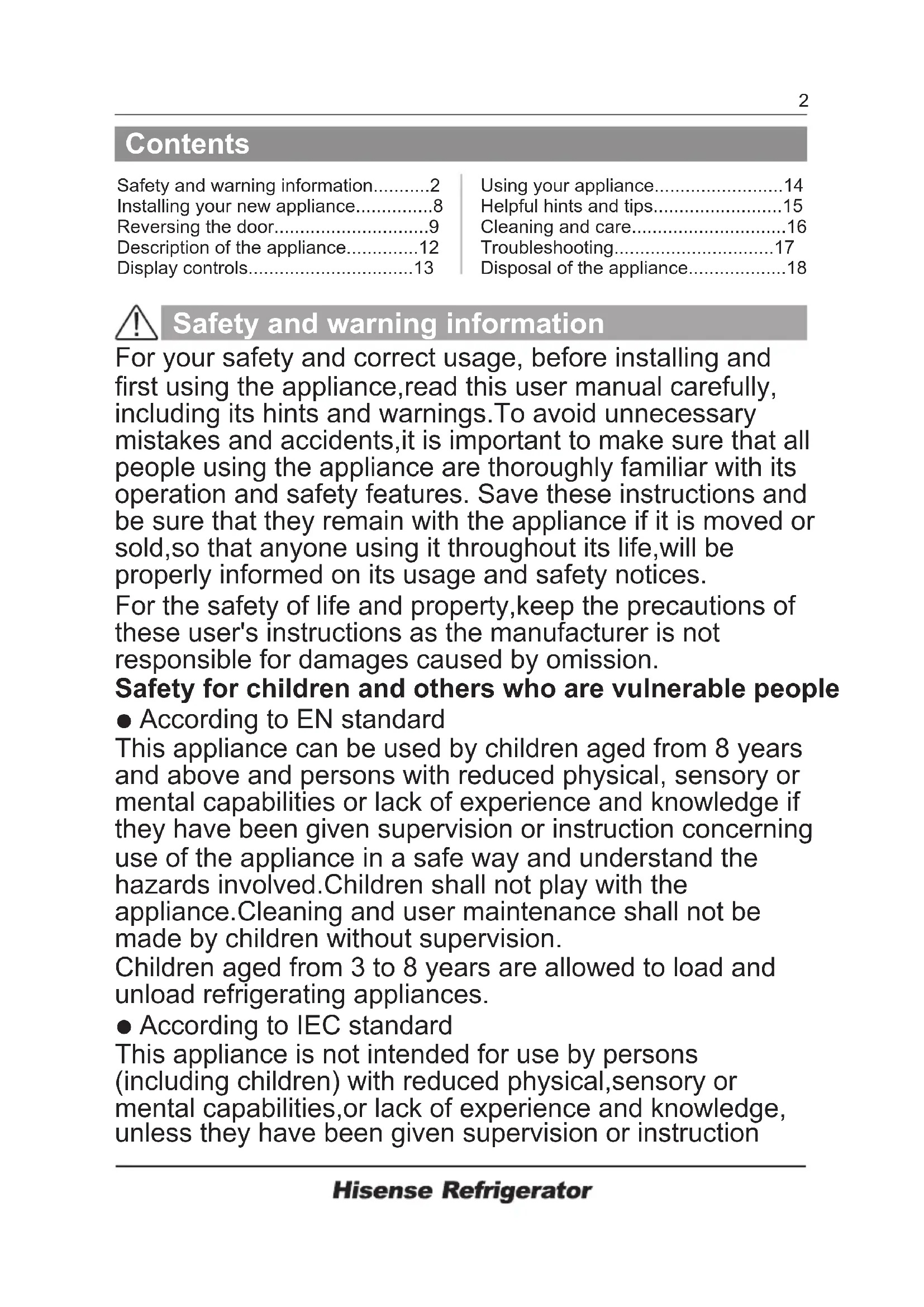 - Disposal of the appliance Safety and warning information For your safety and correct usage, before installing and first using the appliance,read this user manual carefully, including its hints and warnings.To avoid unnecessary mistakes and accidents,it is important to make sure that all people using the appliance are thoroughly familiar with its operation and safety features. Save these instructions and be sure that they remain with the appliance if it is moved or sold,so that anyone using it throughout its life,will be properly informed on its usage and safety notices. For the safety of life and property,keep the precautions of these user's instructions as the manufacturer is not responsible for damages caused by omission. According to EN standard This appliance can be used by children aged from 8 years and above and persons with reduced physical, sensory or mental capabilities or lack of experience and knowledge if they have been given supervision or instruction concerning use of the appliance in a safe way and understand the hazards involved.Children shall not play with the appliance.Cleaning and user maintenance shall not be made by children without supervision. Children aged from 3 to 8 years are allowed to load and unload refrigerating appliances. According to IEC standard This appliance is not intended for use by persons (including children) with reduced physical,sensory or mental capabilities,or lack of experience and knowledge, unless they have been given supervision or instruction Safety for children and others who are vulnerable people p. 18