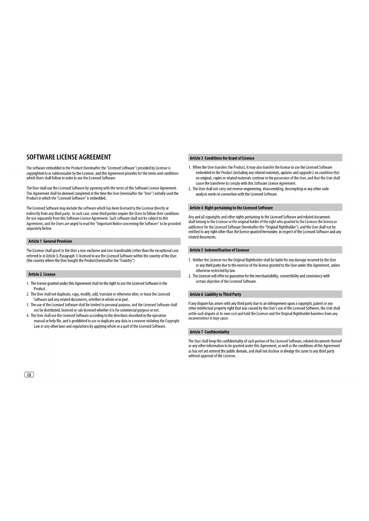 The software embedded in the Product (hereinafter the "Licensed Software") provided by Licensor is copyrighted to or sublicensable by the Licensor, and this Agreement provides for the terms and conditions which Users shall follow in order to use the Licensed Software. The User shall use the Licensed Software by agreeing with the terms of this Software License Agreement. This Agreement shall be deemed completed at the time the User (hereinafter the "User") initially used the Product in which the "Licensed Software" is embedded. The Licensed Software may include the software which has been licensed to the Licensor directly or indirectly from any third party. In such case, some third parties require the Users to follow their conditions for use separately from this Software License Agreement. Such software shall not be subject to this Agreement, and the Users are urged to read the "Important Notice concerning the Software" to be provided separately below. Article 1 General Provision The Licensor shall grant to the User a non-exclusive and non-transferable (other than the exceptional case referred to in Article 3, Paragraph 1) licensed to use the Licensed Software within the country of the User. (the country where the User bought the Product(hereinafter the "Country") Article 2 License