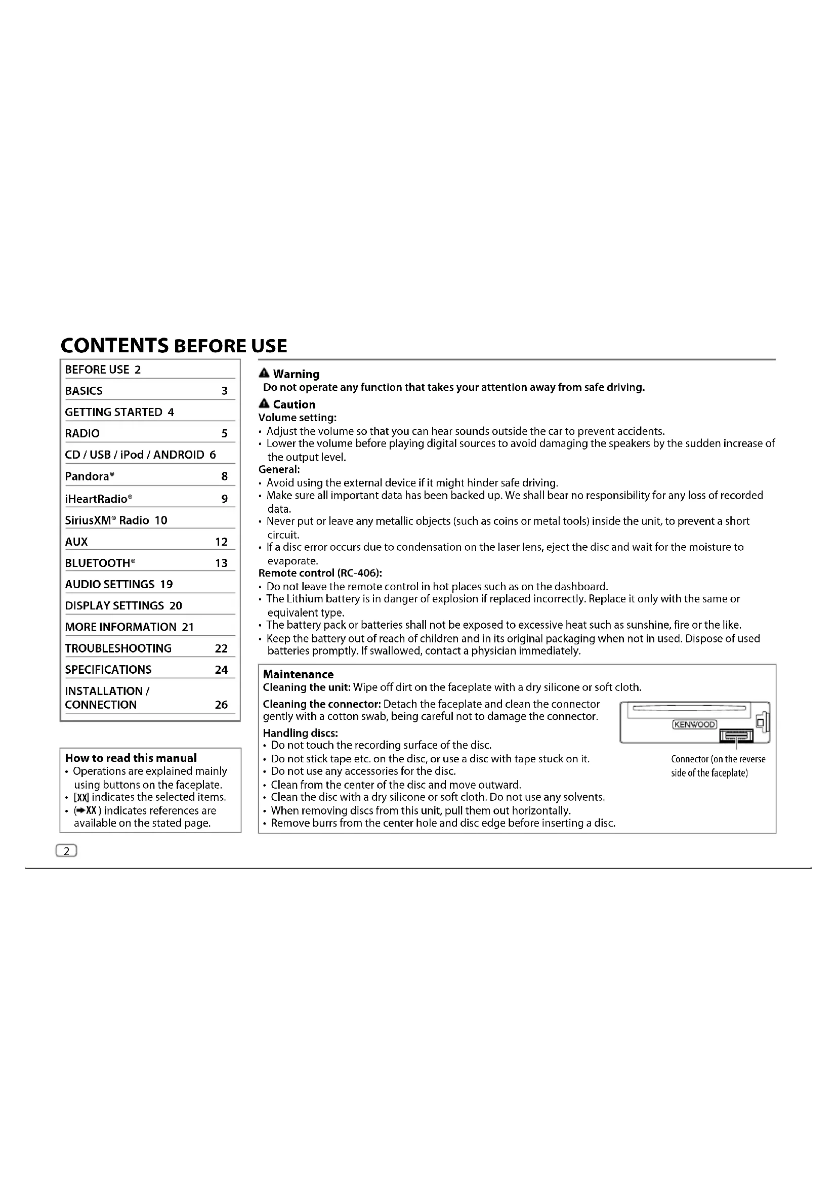 - Keep the battery out of reach of children and in its original packaging when not in used. Dispose of used batteries promptly. If swallowed, contact a physician immediately. BEFORE USE 2 BASICS 3 GETTING STARTED 4 RADIO 5 CD / USB / iPod / ANDROID 6 Pandora® 8 iHeartRadio® 9 SiriusXM® Radio 10 AUX 12 BLUETOOTH® 13 AUDIO SETTINGS 19 DISPLAY SETTINGS 20 MORE INFORMATION 21 TROUBLESHOOTING 22 SPECIFICATIONS 24 INSTALLATION / CONNECTION 26 How to read this manual