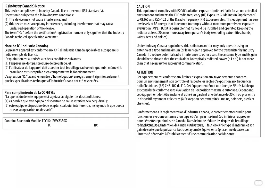 Data Size: B6L (182 mm x 128 mm) Book Size: B6L (182 mm x 128 mm) SPECIFICATIONS CD player MP3 Decode Compliant with MPEG-1/2 Audio Layer-3 WMA Decode Compliant with Windows Media Audio AAC Decode AAC-LC “.aac” files USB USB Standard USB1.1, USB2.0 (Full speed) File System FAT12/16/32 Maximum Supply Current DC5V 1.5A MP3 Decode Compliant with MPEG-1/2 Audio Layer-3 WMA Decode Compliant with Windows Media Audio AAC Decode AAC-LC “.aac” files WAV Decode Linear-PCM FLAC Decode FLAC file (Up to 48kHz / 16bit) Bluetooth Version Bluetooth Ver.2.1+EDR / Bluetooth 3.0 Frequency Range 2.402GHz — 2.480GHz Output Power +4dBm (MAX), 0dBm (AVE) Power Class 2 Maximum Communication Range Line of sight approx. 10m (32.8ft) Profile HFP (Hands-Free Profile) A2DP (Advanced Audio Distribution Profile) AVRCP (Audio/Video Remote Control Profile) SPP (Serial Port Profile) PBAP (Phonebook Access Profile) Auxiliary
