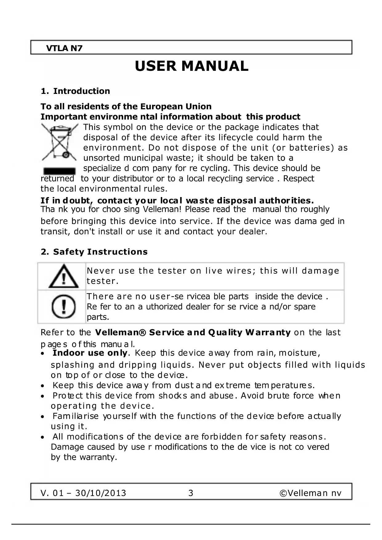 - All modifications of the device are forbidden for safety reasons. Damage caused by use r modifications to the de vice is not co vered by the warranty.VTLA N7
