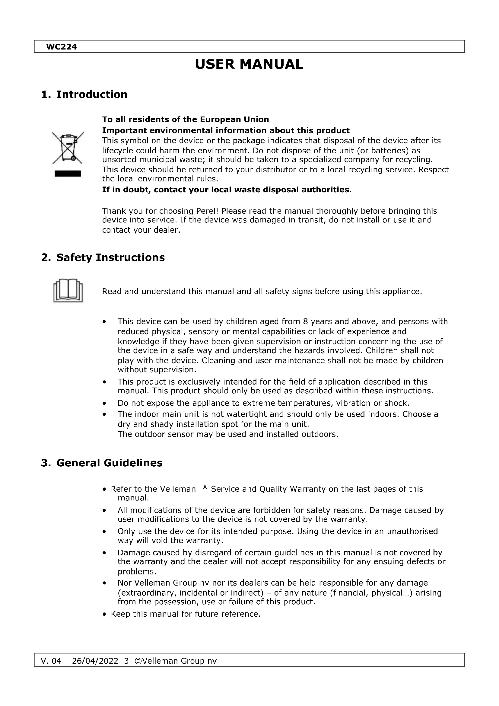 Download the instructions for your Weather Station in PDF format for free! Find your manual WC224 - Perel and take your electronic device back in hand. On this page are published all the documents necessary for the use of your device. WC224 by Perel.