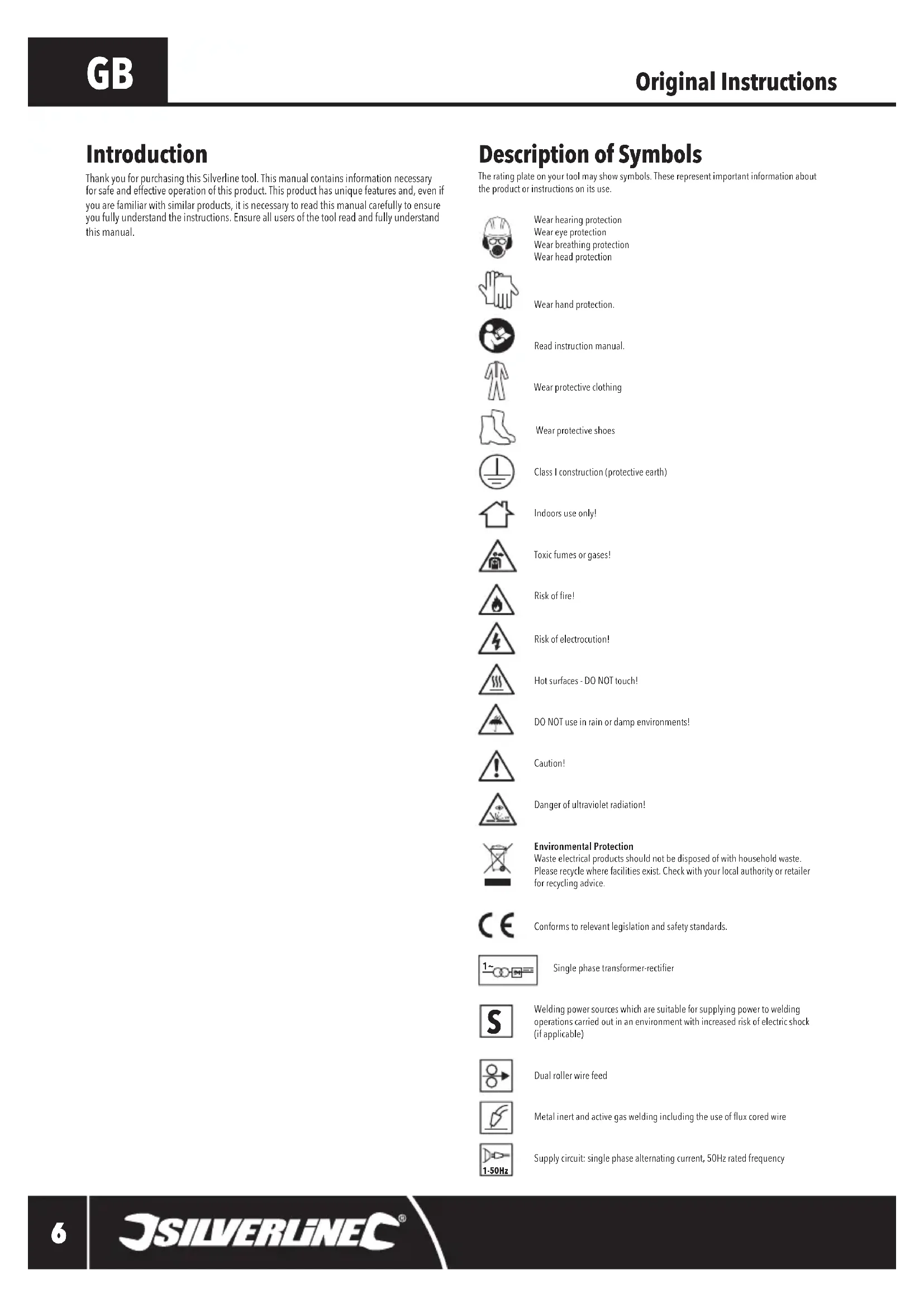 Introduction Thank you for purchasing this Silverline tool. This manual contains information necessary for safe and effective operation of this product. This product has unique features and, even if you are familiar with similar products, it is necessary to read this manual carefully to ensure you fully understand the instructions. Ensure all users of the tool read and fully understand this manual. Original Instructions Description of Symbols The rating plate on your tool may show symbols. These represent important information about the product or instructions on its use.Wear hearing protection Wear eye protection Wear breathing protection Wear head protectionWear hand protection.Read instruction manual. Wear protective clothing Wear protective shoesClass I construction (protective earth)Indoors use only!Toxic fumes or gases!Risk of re!Risk of electrocution!Hot surfaces - DO NOT touch!DO NOT use in rain or damp environments!Caution!Danger of ultraviolet radiation!Environmental Protection Waste electrical products should not be disposed of with household waste. Please recycle where facilities exist. Check with your local authority or retailer for recycling advice.Conforms to relevant legislation and safety standards. Single phase transformer-rectierWelding power sources which are suitable for supplying power to welding operations carried out in an environment with increased risk of electric shock (if applicable)Dual roller wire feedMetal inert and active gas welding including the use of ux cored wireSupply circuit: single phase alternating current, 50Hz rated frequency