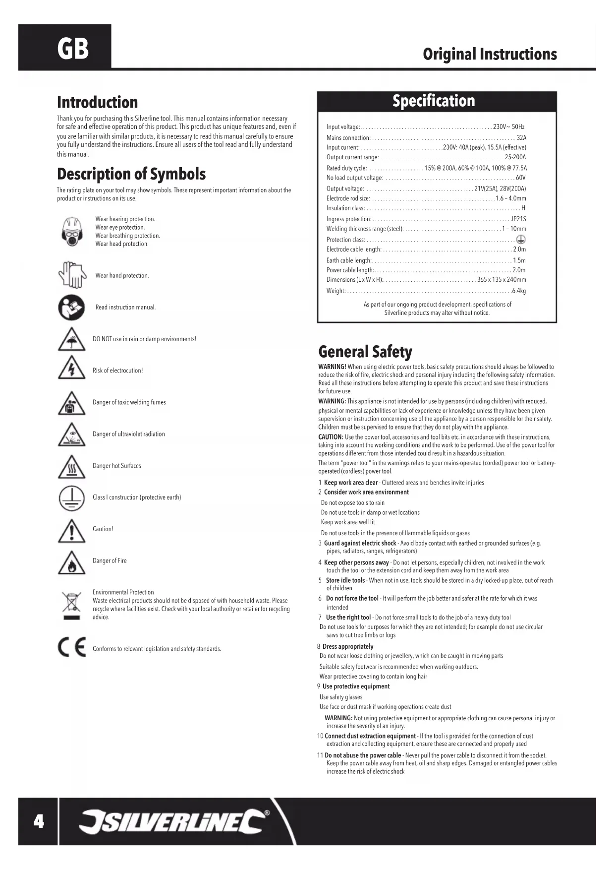Input voltage:................................................230V~ 50Hz Mains connection: . . . . . . . . . . . . . . . . . . . . . . . . . . . . . . . . . . . . . . . . . . . . . . . . . . . . 32A Input current: ..............................230V: 40A (peak), 15.5A (effective) Output current range: .............................................25-200ARated duty cycle: ....................15% @ 200A, 60% @ 100A, 100% @ 77.5ANo load output voltage: ...............................................60VOutput voltage: .......................................21V(25A), 28V(200A) Electrode rod size: .............................................1.6 – 4.0mm Insulation class: ........................................................H Ingress protection:...................................................IP21S Welding thickness range (steel): ...................................1 – 10mm Protection class: ...................................................... Electrode cable length: ...............................................2.0mEarth cable length:...................................................1.5mPower cable length:..................................................2.0m Dimensions (L x W x H):..................................365 x 135 x 240mm Weight: ............................................................6.4kg As part of our ongoing product development, specications of Silverline products may alter without notice. Specication General Safety WARNING! When using electric power tools, basic safety precautions should always be followed to reduce the risk of re, electric shock and personal injury including the following safety information. Read all these instructions before attempting to operate this product and save these instructions for future use.WARNING: This appliance is not intended for use by persons (including children) with reduced, physical or mental capabilities or lack of experience or knowledge unless they have been given supervision or instruction concerning use of the appliance by a person responsible for their safety. Children must be supervised to ensure that they do not play with the appliance. CAUTION: Use the power tool, accessories and tool bits etc. in accordance with these instructions, taking into account the working conditions and the work to be performed. Use of the power tool for operations different from those intended could result in a hazardous situation.The term "power tool" in the warnings refers to your mains-operated (corded) power tool or battery-operated (cordless) power tool.1 Keep work area clear - Cluttered areas and benches invite injuries2 Consider work area environment Do not expose tools to rain Do not use tools in damp or wet locations Keep work area well lit Do not use tools in the presence of ammable liquids or gases3 Guard against electric shock - Avoid body contact with earthed or grounded surfaces (e.g. pipes, radiators, ranges, refrigerators)4 Keep other persons away - Do not let persons, especially children, not involved in the work touch the tool or the extension cord and keep them away from the work area 5 Store idle tools - When not in use, tools should be stored in a dry locked-up place, out of reach of children 6 Do not force the tool - It will perform the job better and safer at the rate for which it was intended 7 Use the right tool - Do not force small tools to do the job of a heavy duty tool Do not use tools for purposes for which they are not intended; for example do not use circular saws to cut tree limbs or logs8 Dress appropriately Do not wear loose clothing or jewellery, which can be caught in moving parts Suitable safety footwear is recommended when working outdoors. Wear protective covering to contain long hair9 Use protective equipment Use safety glasses Use face or dust mask if working operations create dust