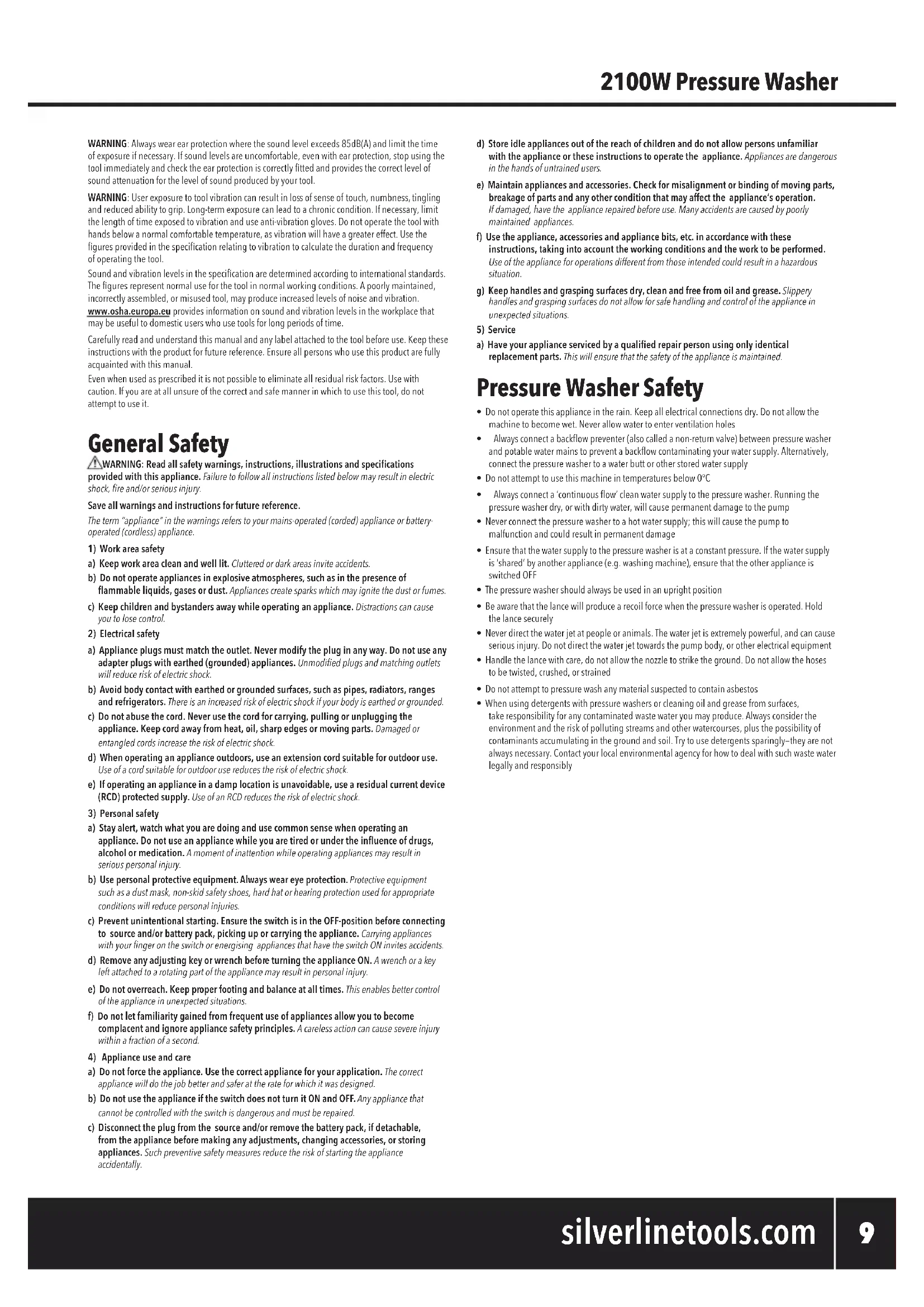No load speed˚ DegreesØ DiameterHz HertzW, kW Watt, kilowatt/min or min Operations per minute Introduction ThankyouforpurchasingthisSilverlinetool.Thismanualcontainsinformationnecessaryfor safe and effective operation of this product. This product has unique features and, even if you are familiar with similar products, it is necessary to read this manual carefully to ensure you fully understand the instructions. Ensure all users of the tool read and fully understand this manual. Original Instructions 943676_Manual.indd 8 04/07/2019 16:062100W Pressure Washer
