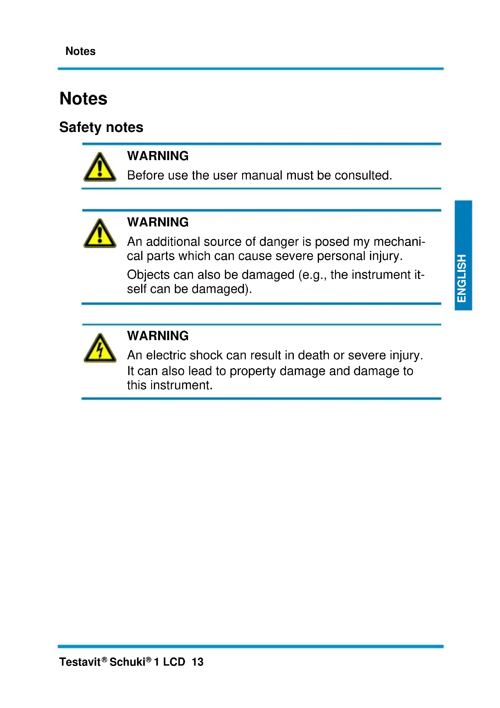 WARNING An electric shock can result in death or severe injury. It can also lead to property damage and damage to this instrument.Notes 14 Testavit