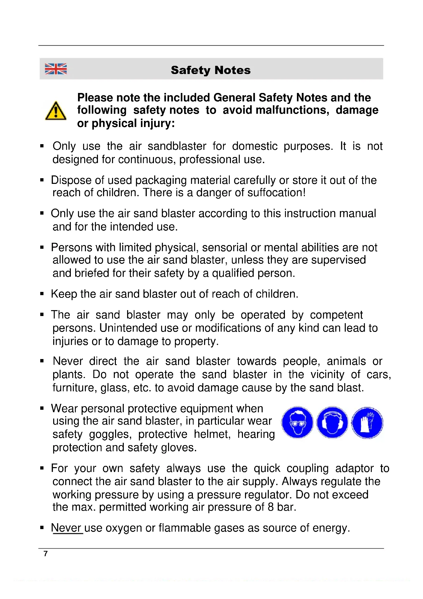 Please note the included General Safety Notes and the following safety notes to avoid malfunctions, damage or physical injury:8 Safety Notes Check if all connections and hoses are mechanically secured and if they are functioning properly. Loose hoses may cause severe injuries. Disconnect the air sand blaster from the compressed air source before doing any maintenance work or when not in use. Do not modify the air sand blaster in any way and do not use it for any unintended use. Only use original accessory. Not recommended accessory can bear a risk of danger. Never carry the unit with the hose. Carry it with the housing. Keep the handle dry and free from oil or grease. Do not use the air sand blaster near flammable liquids, gases or dust. Sparks may ignite the dust or fumes. Stay alert! Watch what you are doing. Use common sense. Do not use the air sand blaster any further in case of damage. Do not open the unit and do not try to repair them yourself. In case of questions or problems contact a professional or our customer service.9 Operation Intended Use The air sand blaster is a tool driven by compressed air. It is designed for versatile use. The air sand blaster is suitable for sand-blasting of iron, sheet metal, metal objects, etc. The intended use also includes an operation following the operating instructions. Any use beyond these parameters (different media, applying force) or any changes (reconstruction, no original accessory) can lead to serious risks and is regarded as use that is contrary to the intended purpose. Before first Use Unpack the air sand blaster and the required accessory and check all parts for any damage in transit. Dispose of packaging materials or store them out of reach of children. Plastic bags etc. may become a deadly toy for children. Start-up