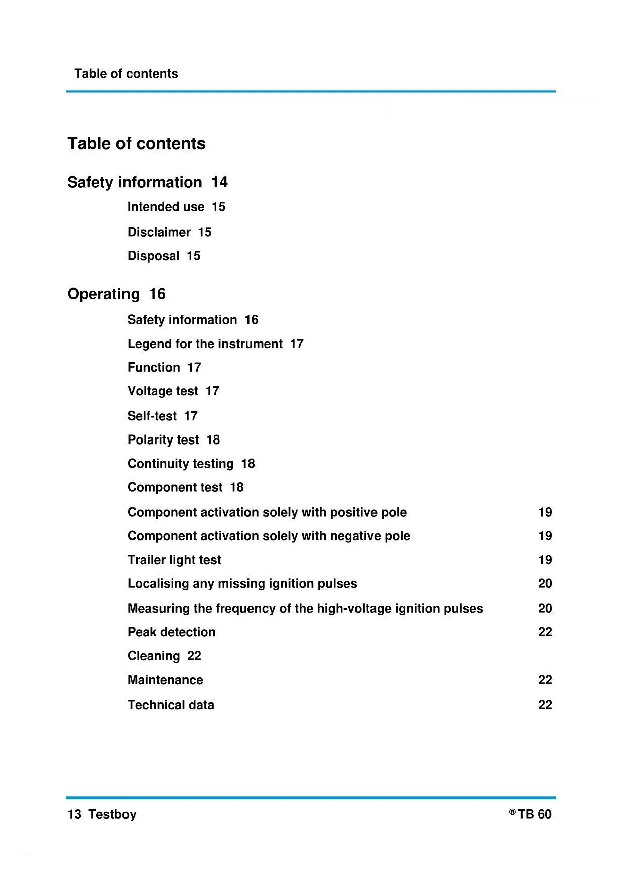 TB 60 ENGLISH Table of contents Safety information 14 Intended use 15 Disclaimer 15 Disposal 15 Operating 16 Safety information 16 Legend for the instrument 17 Function 17 Voltage test 17 Self-test 17 Polarity test 18 Continuity testing 18 Component test 18 Component activation solely with positive pole 19 Component activation solely with negative pole 19 Trailer light test 19 Localising any missing ignition pulses 20 Measuring the frequency of the high-voltage ignition pulses 20 Peak detection 22 Cleaning 22 Maintenance 22 Technical data 22Safety information Testboy