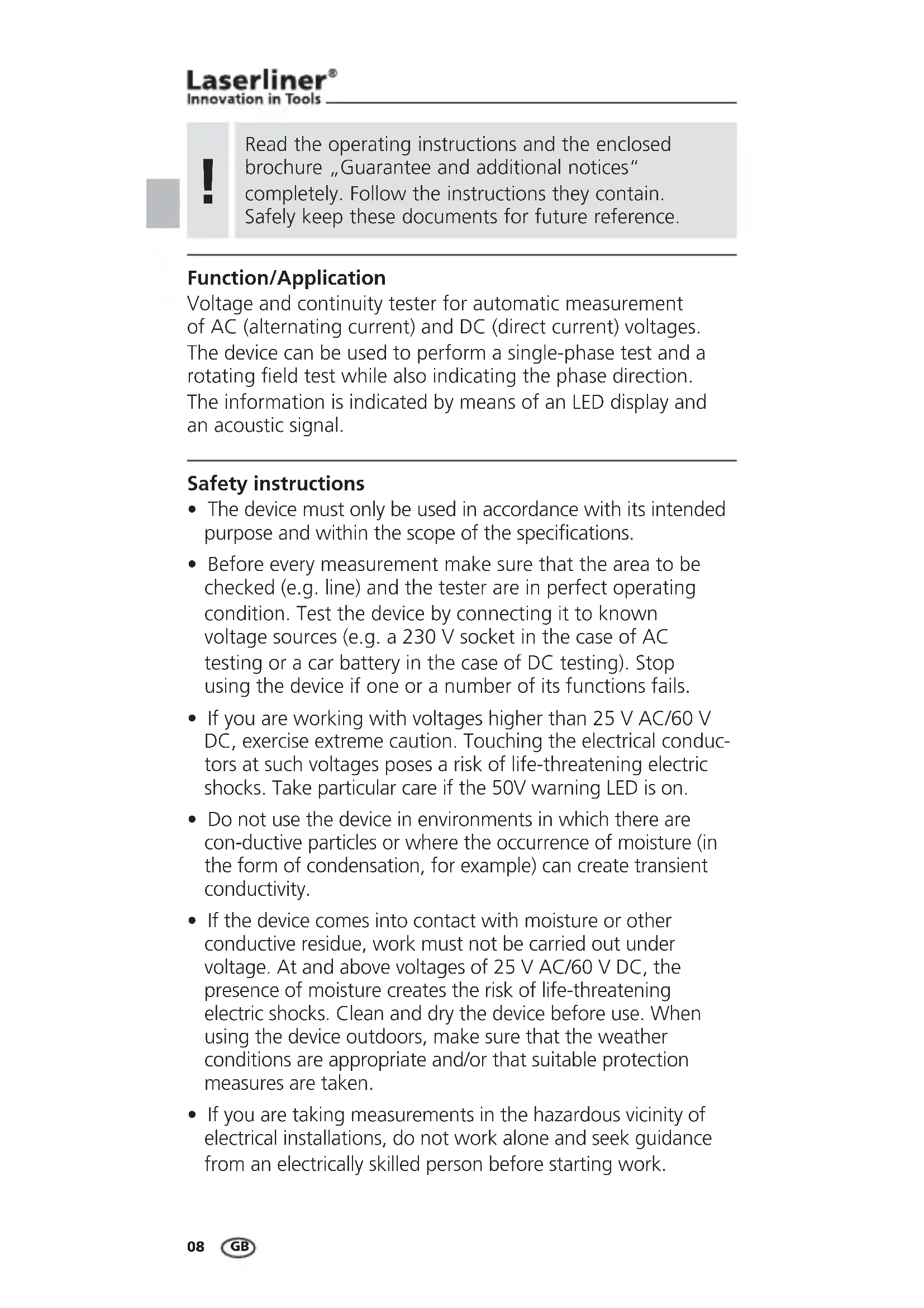 lBefore every measurement make sure that the area to be checked (e.g. line) and the tester are in perfect operating condition. Test the device by connecting it to known voltage sources (e.g. a 230 V socket in the case of AC testing or a car battery in the case of DC testing). Stop using the device if one or a number of its functions fails. l(EXNT@QDVNQJHMFVHSGUNKS@FDRGHFGDQSG@M5 "5 DC, exercise extreme caution. Touching the electrical conduc- tors at such voltages poses a risk of life-threatening electric RGNBJR3@JDO@QSHBTK@QB@QDHESGD5V@QMHMF+$#HRNM lDo not use the device in environments in which there are con-ductive particles or where the occurrence of moisture (in the form of condensation, for example) can create transient conductivity. l(ESGDCDUHBDBNLDRHMSNBNMS@BSVHSGLNHRSTQDNQNSGDQ conductive residue, work must not be carried out under UNKS@FD S@MC@ANUDUNKS@FDRNE5 "5#"SGD presence of moisture creates the risk of life-threatening electric shocks. Clean and dry the device before use. When using the device outdoors, make sure that the weather conditions are appropriate and/or that suitable protection measures are taken. lIf you are taking measurements in the hazardous vicinity of electrical installations, do not work alone and seek guidance from an electrically skilled person before starting work. Read the operating instructions and the enclosed brochure „Guarantee and additional notices“ completely. Follow the instructions they contain. Safely keep these documents for future reference.