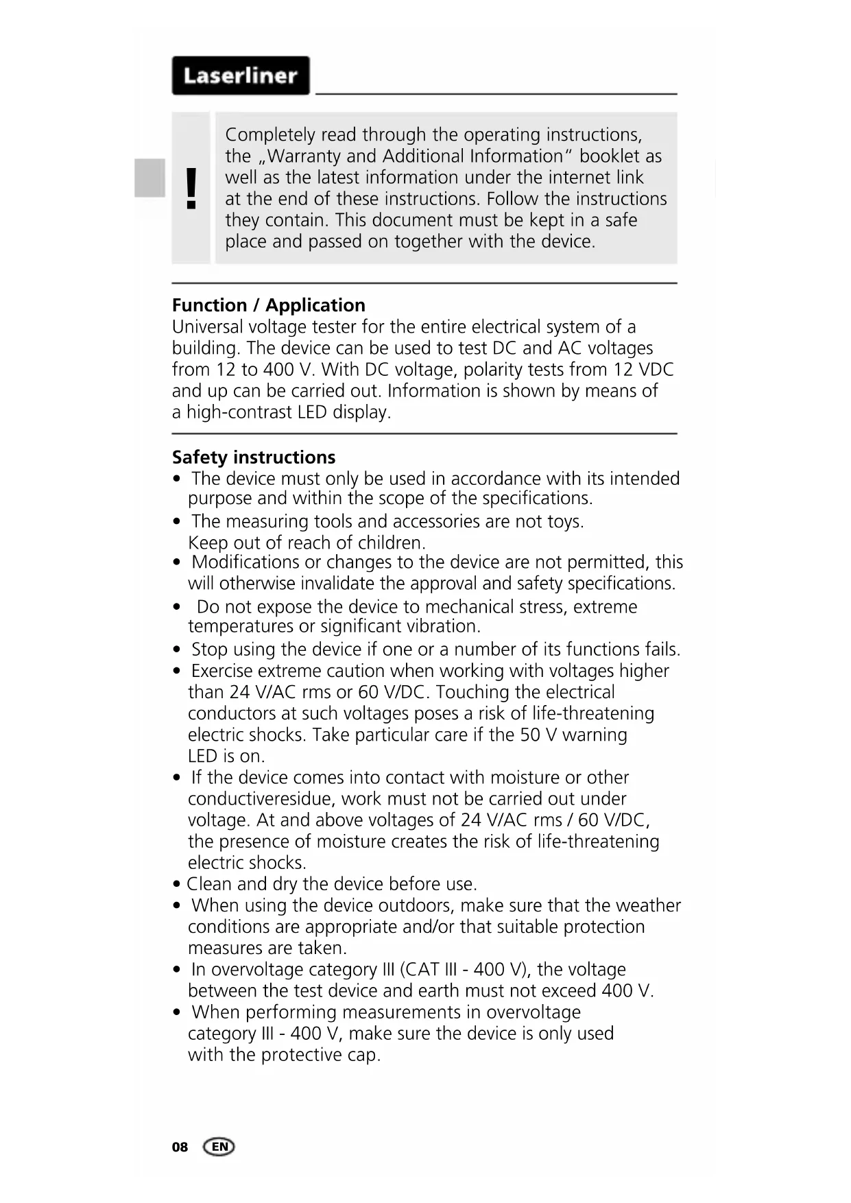 Function / Application Universal voltage tester for the entire electrical system of a building. The device can be used to test DC and AC voltages from 12 to 400 V. With DC voltage, polarity tests from 12 VDC and up can be carried out. Information is shown by means of a high-contrast LED display. Safety instructions