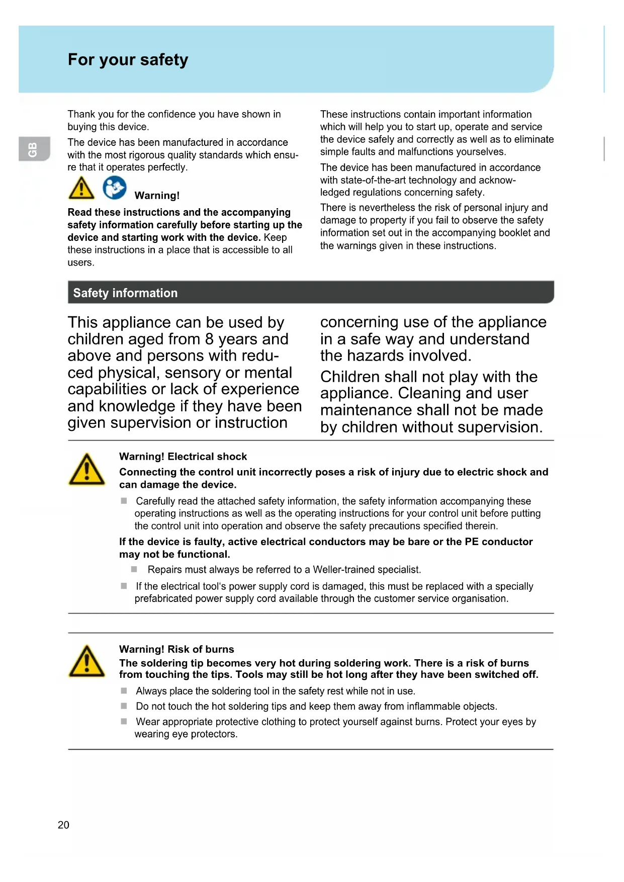 For your safety Thankyouforthecondenceyouhaveshownin buyingthisdevice. The device has been manufactured in accordance withthemostrigorousqualitystandardswhichensu- rethatitoperatesperfectly. Warning! Read these instructions and the accompanying safety information carefully before starting up the device and starting work with the device. Keep these instructions in a place that is accessible to all users. These instructions contain important information whichwillhelpyoutostartup,operateandservice thedevicesafelyandcorrectlyaswellastoeliminate simplefaultsandmalfunctionsyourselves. The device has been manufactured in accordance withstate-of-the-arttechnologyandacknow- ledgedregulationsconcerningsafety. Thereisneverthelesstheriskofpersonalinjuryand damagetopropertyifyoufailtoobservethesafety informationsetoutintheaccompanyingbookletand the warnings given in these instructions. Safety information Thisappliancecanbeusedby childrenagedfrom8yearsand above and persons with redu- cedphysical,sensoryormental capabilities or lack of experience andknowledgeiftheyhavebeen given supervision or instruction concerning use of the appliance inasafewayandunderstand the hazards involved. Childrenshallnotplaywiththe appliance. Cleaning and user maintenance shall not be made bychildrenwithoutsupervision. Warning! Electrical shock Connecting the control unit incorrectly poses a risk of injury due to electric shock and can damage the device. Carefullyreadtheattachedsafetyinformation,thesafetyinformationaccompanyingthese operatinginstructionsaswellastheoperatinginstructionsforyourcontrolunitbeforeputting thecontrolunitintooperationandobservethesafetyprecautionsspeciedtherein. If the device is faulty, active electrical conductors may be bare or the PE conductor may not be functional. RepairsmustalwaysbereferredtoaWeller-trainedspecialist. Iftheelectricaltool‘spowersupplycordisdamaged,thismustbereplacedwithaspecially prefabricatedpowersupplycordavailablethroughthecustomerserviceorganisation. Warning! Risk of burns The soldering tip becomes very hot during soldering work. There is a risk of burns from touching the tips. Tools may still be hot long after they have been switched off. Alwaysplacethesolderingtoolinthesafetyrestwhilenotinuse. Donottouchthehotsolderingtipsandkeepthemawayfrominammableobjects. Wearappropriateprotectiveclothingtoprotectyourselfagainstburns.Protectyoureyesby wearingeyeprotectors.21