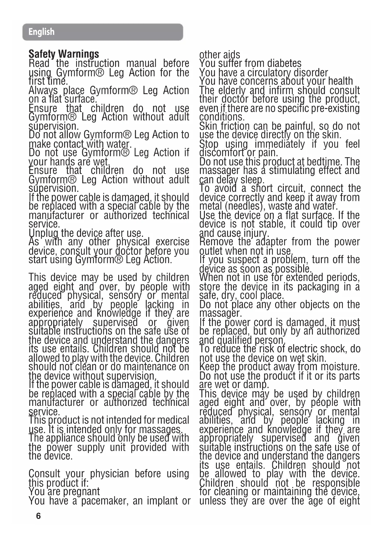 Safety Warnings Read the instruction manual before using Gymform® Leg Action for the first time. Always place Gymform® Leg Action on a flat surface. Ensure that children do not use Gymform® Leg Action without adult supervision. Do not allow Gymform® Leg Action to make contact with water. Do not use Gymform® Leg Action if your hands are wet. Ensure that children do not use Gymform® Leg Action without adult supervision. If the power cable is damaged, it should be replaced with a special cable by the manufacturer or authorized technical service. Unplug the device after use. As with any other physical exercise device, consult your doctor before you start using Gymform® Leg Action. This device may be used by children aged eight and over, by people with reduced physical, sensory or mental abilities, and by people lacking in experience and knowledge if they are appropriately supervised or given suitable instructions on the safe use of the device and understand the dangers its use entails. Children should not be allowed to play with the device. Children should not clean or do maintenance on the device without supervision. If the power cable is damaged, it should be replaced with a special cable by the manufacturer or authorized technical service. This product is not intended for medical use. It is intended only for massages. The appliance should only be used with the power supply unit provided with the device. Consult your physician before using this product if: You are pregnant You have a pacemaker, an implant or other aids You suffer from diabetes You have a circulatory disorder You have concerns about your health The elderly and infirm should consult their doctor before using the product, even if there are no specific pre-existing conditions. Skin friction can be painful, so do not use the device directly on the skin. Stop using immediately if you feel discomfort or pain. Do not use this product at bedtime. The massager has a stimulating effect and can delay sleep. To avoid a short circuit, connect the device correctly and keep it away from metal (needles), waste and water. Use the device on a flat surface. If the device is not stable, it could tip over and cause injury. Remove the adapter from the power outlet when not in use. If you suspect a problem, turn off the device as soon as possible. When not in use for extended periods, store the device in its packaging in a safe, dry, cool place. Do not place any other objects on the massager. If the power cord is damaged, it must be replaced, but only by an authorized and qualified person. To reduce the risk of electric shock, do not use the device on wet skin. Keep the product away from moisture. Do not use the product if it or its parts are wet or damp. This device may be used by children aged eight and over, by people with reduced physical, sensory or mental abilities, and by people lacking in experience and knowledge if they are appropriately supervised and given suitable instructions on the safe use of the device and understand the dangers its use entails. Children should not be allowed to play with the device. Children should not be responsible for cleaning or maintaining the device, unless they are over the age of eight English7 and supervised by an adult. Keep the device and its cable out of the reach of children under the age of eight. To avoid injury and irreparable damage, always sit while using the massager. To avoid dangerous injury, never stand on the unit or use it forcefully. Do not attempt to disassemble or repair the product. Repairs may only be carried out by suitably qualified technicians. Product Description: