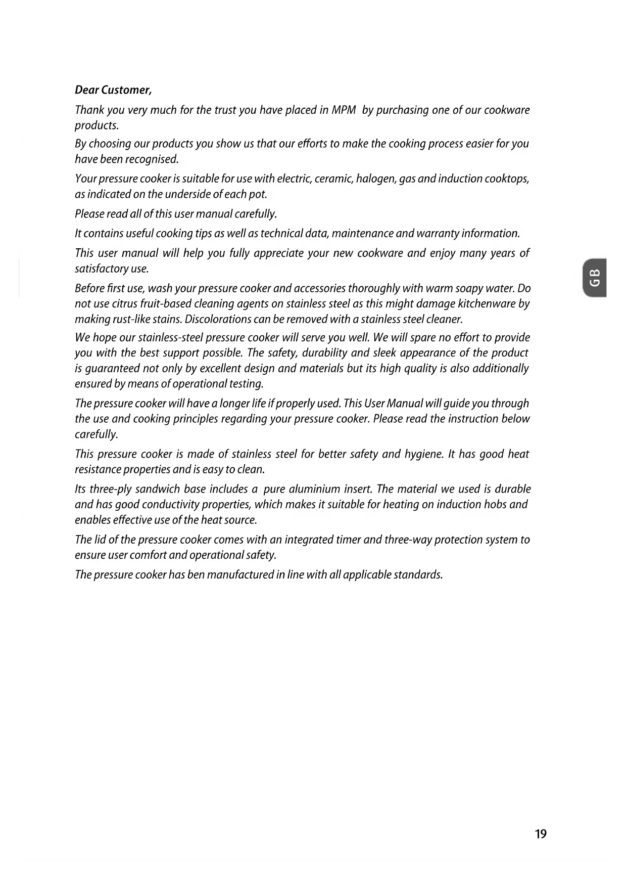 Dear Customer, Thank you very much for the trust you have placed in MPM by purchasing one of our cookware products. By choosing our products you show us that our eorts to make the cooking process easier for you have been recognised. Your pressure cooker is suitable for use with electric, ceramic, halogen, gas and induction cooktops, as indicated on the underside of each pot. Please read all of this user manual carefully. It contains useful cooking tips as well as technical data, maintenance and warranty information. This user manual will help you fully appreciate your new cookware and enjoy many years of satisfactory use. Before rst use, wash your pressure cooker and accessories thoroughly with warm soapy water. Do not use citrus fruit-based cleaning agents on stainless steel as this might damage kitchenware by making rust-like stains. Discolorations can be removed with astainless steel cleaner. We hope our stainless-steel pressure cooker will serve you well. We will spare no eort to provide you with the best support possible. The safety, durability and sleek appearance of the product is guaranteed not only by excellent design and materials but its high quality is also additionally ensured by means of operational testing. The pressure cooker will have alonger life if properly used. This User Manual will guide you through the use and cooking principles regarding your pressure cooker. Please read the instruction below carefully. This pressure cooker is made of stainless steel for better safety and hygiene. It has good heat resistance properties and is easy to clean. Its three-ply sandwich base includes a pure aluminium insert. The material we used is durable and has good conductivity properties, which makes it suitable for heating on induction hobs and enables eective use of the heat source. The lid of the pressure cooker comes with an integrated timer and three-way protection system to ensure user comfort and operational safety. The pressure cooker has ben manufactured in line with all applicable standards.20