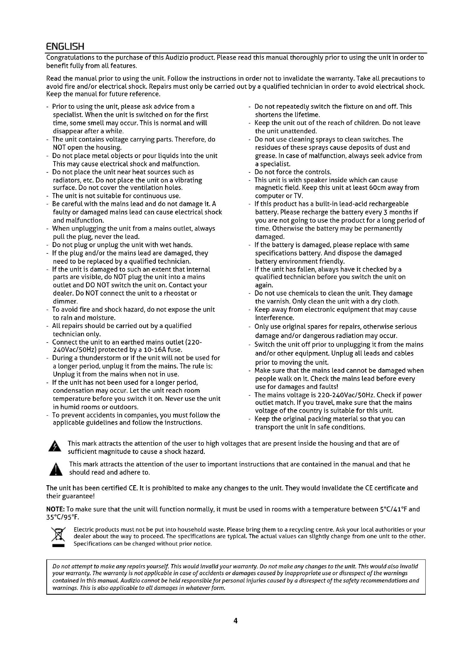 Do not attempt to make any repairs yourself. This would invalid your warranty. Do not make any changes to the unit. This would also invalid your warranty. The warranty is not applicable in case of accidents or damages caused by inappropriate use or disrespect of the warnings contained in this manual. Audizio cannot be held responsible for personal injuries caused by a disrespect of the safety recommendations and warnings. This is also applicable to all damages in whatever form.5 CAUTION! Immediately upon receiving the product, carefully unpack the carton, check the contents to ensure that all parts are present, and have been received in good condition. Notify the shipper immediately and retain packing material for inspection if any parts appear damage from shipping or the package itself shows signs of mishandling. Save the package and all packing materials. In the event that the product must be returned to the factory, it is important that the product be returned in the original factory box and packing. If the device has been exposed to drastic temperature fluctuation (e.g. after transportation), do not switch it on immediately. The arising condensation water might damage your device. Leave the device switched off until it has reached room temperature.