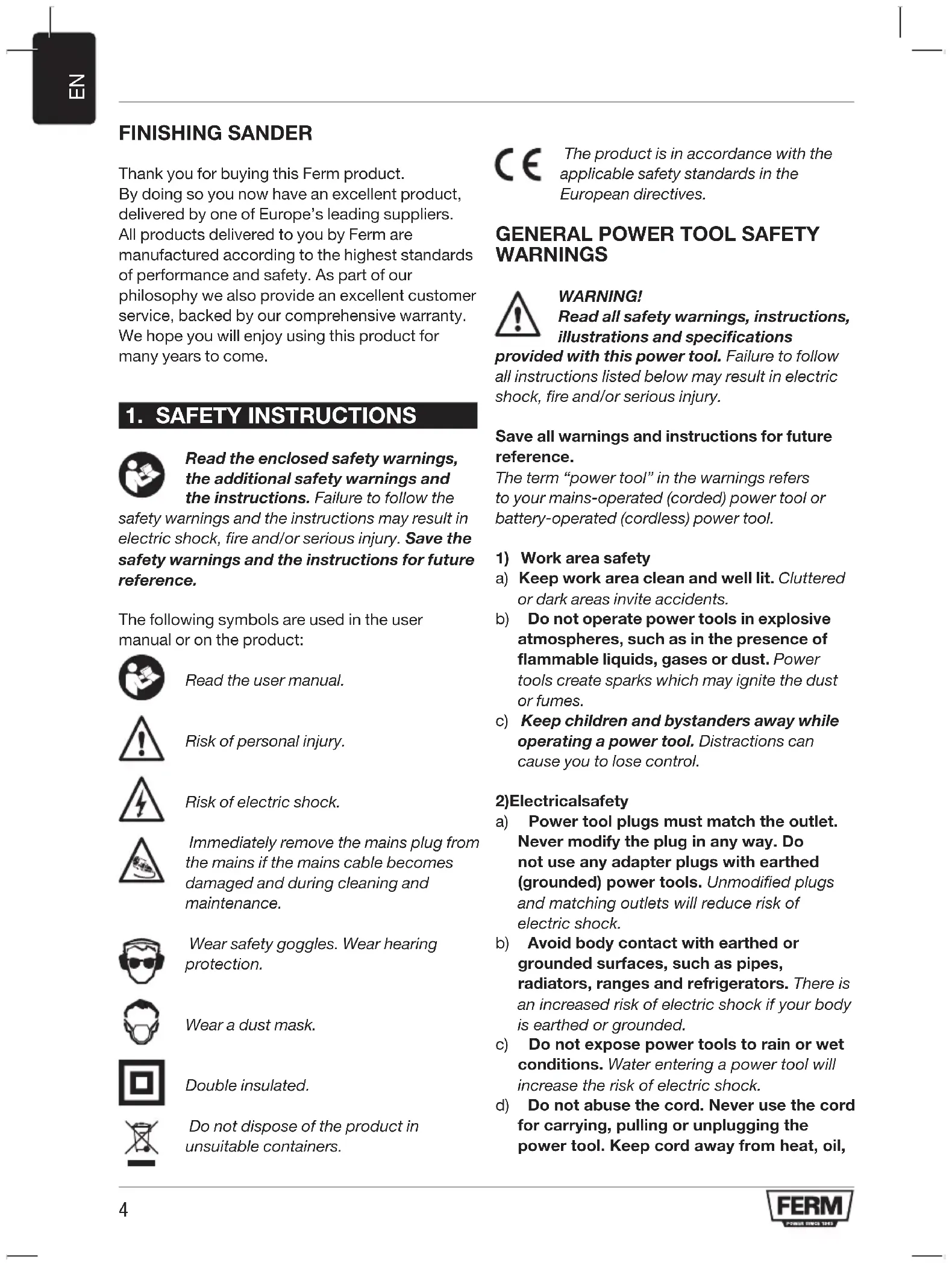 FINISHING SANDER Thank you for buying this Ferm product. By doing so you now have an excellent product, delivered by one of Europe’s leading suppliers. All products delivered to you by Ferm are manufactured according to the highest standards of performance and safety. As part of our philosophy we also provide an excellent customer service, backed by our comprehensive warranty. We hope you will enjoy using this product for many years to come.