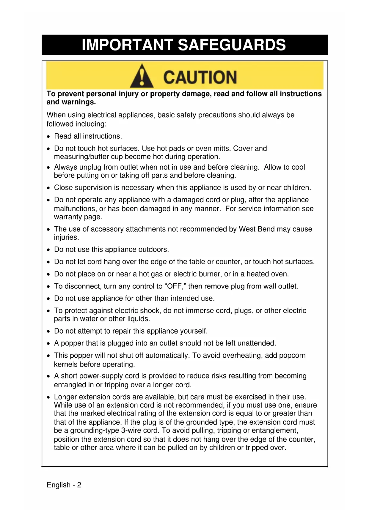 - The use of accessory attachments not recommended by West Bend may cause injuries.
