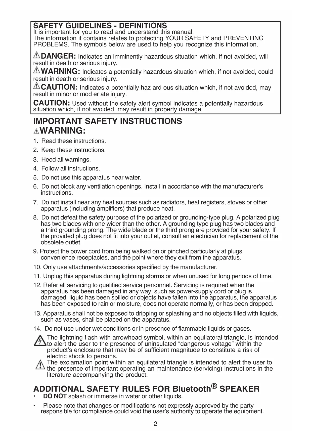 The lightning flash with arrowhead symbol, within an equilateral triangle, is intended to alert the user to the presence of uninsulated “dangerous voltage” within the product’s enclosure that may be of sufficient magnitude to constitute a risk of electric shock to persons. The exclamation point within an equilateral triangle is intended to alert the user to the presence of important operating an maintenance (servicing) instructions in the literature accompanying the product. ADDITIONAL SAFETY RULES FOR Bluetooth