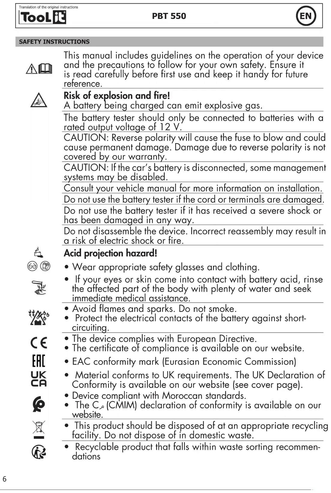 Notice originaleSAFETY INSTRUCTIONS This manual includes guidelines on the operation of your device and the precautions to follow for your own safety. Ensure it is read carefully before rst use and keep it handy for future reference. Risk of explosion and re! A battery being charged can emit explosive gas. The battery tester should only be connected to batteries with a rated output voltage of 12 V. CAUTION: Reverse polarity will cause the fuse to blow and could cause permanent damage. Damage due to reverse polarity is not covered by our warranty. CAUTION: If the car’s battery is disconnected, some management systems may be disabled. Consult your vehicle manual for more information on installation. Do not use the battery tester if the cord or terminals are damaged. Do not use the battery tester if it has received a severe shock or has been damaged in any way. Do not disassemble the device. Incorrect reassembly may result in a risk of electric shock or re. Acid projection hazard!