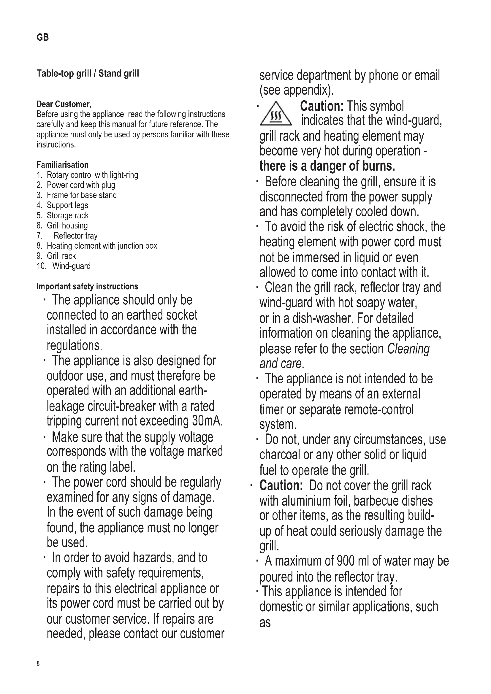 Caution: This symbol indicates that the wind-guard, grill rack and heating element may become very hot during operation - there is a danger of burns. ∙ Before cleaning the grill, ensure it is disconnected from the power supply and has completely cooled down. ∙ To avoid the risk of electric shock, the heating element with power cord must not be immersed in liquid or even allowed to come into contact with it. ∙ Cleanthegrillrack,reectortrayand wind-guard with hot soapy water, or in a dish-washer. For detailed information on cleaning the appliance, please refer to the section Cleaning and care. ∙ The appliance is not intended to be operated by means of an external timer or separate remote-control system. ∙ Do not, under any circumstances, use charcoal or any other solid or liquid fuel to operate the grill. ∙ Caution: Do not cover the grill rack with aluminium foil, barbecue dishes or other items, as the resulting build- up of heat could seriously damage the grill. ∙ A maximum of 900 ml of water may be pouredintothereectortray. ∙ This appliance is intended for domestic or similar applications, such