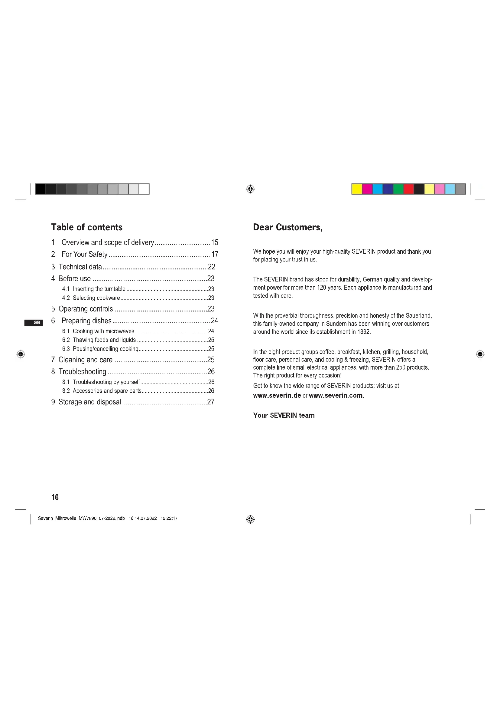 - Turntable Severin_Mikrowelle_MW7890_07-2022.indb 15 14.07.2022 15:22:1716 GB GB Dear Customers, We hope you will enjoy your high-quality SEVERIN product and thank you for placing your trust in us. The SEVERIN brand has stood for durability, German quality and develop- ment power for more than 120 years. Each appliance is manufactured and tested with care. With the proverbial thoroughness, precision and honesty of the Sauerland, this family-owned company in Sundern has been winning over customers around the world since its establishment in 1892. In the eight product groups coffee, breakfast, kitchen, grilling, household, oor care, personal care, and cooling & freezing, SEVERIN offers a complete line of small electrical appliances, with more than 250 products. The right product for every occasion! Get to know the wide range of SEVERIN products; visit us at www.severin.de or www.severin.com. Your SEVERIN team Table of contents 1 Overview and scope of delivery p. 15