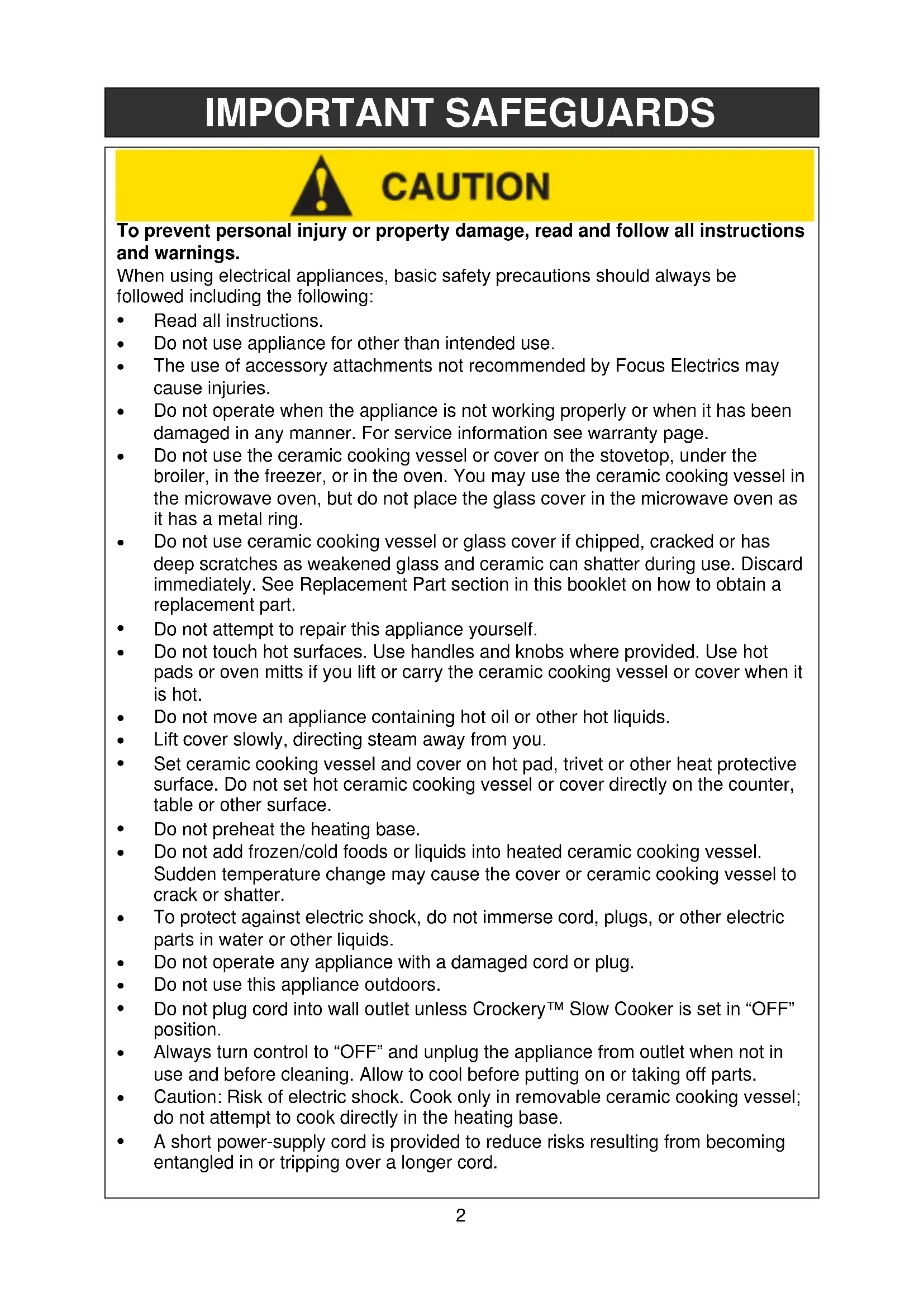 EPLACEMENT PARTS Replacement parts, if available, may be ordered directly from Focus Electrics, LLC several ways. Order online at www.focuselectrics.com, e-mail service@focuselectrics.com, over the phone by calling (866)290-1851, or by writing to: Focus Electrics, LLC Attn: Customer Service P. O. Box 2780 West Bend, WI 53095 To order with a check or money order, please first contact Customer Service for an order total. Mail your payment along with a letter stating the model or catalog number of your appliance, which can be found on the bottom or back of the unit, a description of the part or parts you are ordering, and the quantity you would like. Your check should be made payable to Focus Electrics, LLC. Your state/province’s sales tax and a shipping fee will be added to your total charge. Please allow two weeks for processing and delivery. This manual contains important and helpful information regarding the safe use and care of your new Focus Electrics product. For future reference, attach dated sales receipt for warranty proof of purchase and record the following information: Date purchased or received as gift: _______________________________________________ Where purchased and price, if known: _____________________________________________ Item number and Date Code (shown bottom/back of product):___________________________ 2010 West Bend, a Brand of Focus Electrics, LLC. www.focuselectrics.com