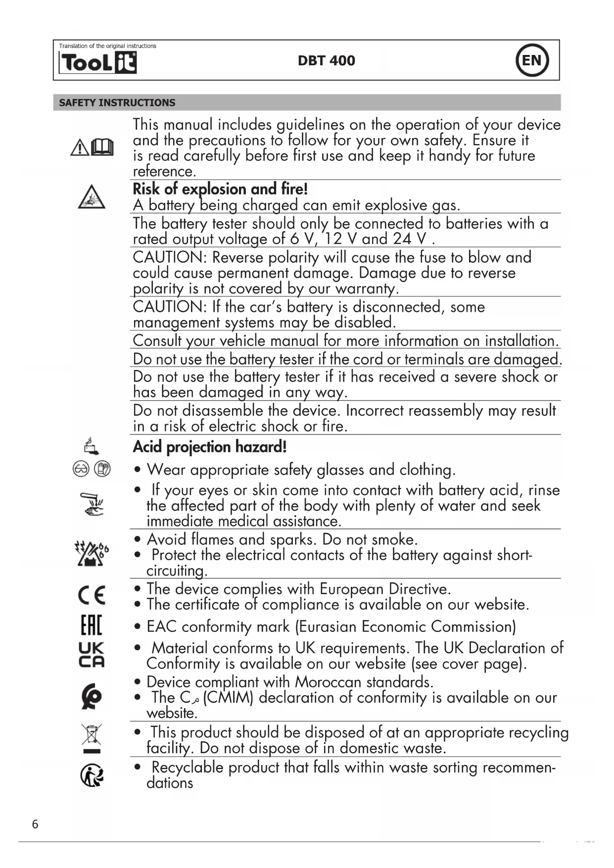 Notice originaleSAFETY INSTRUCTIONS This manual includes guidelines on the operation of your device and the precautions to follow for your own safety. Ensure it is read carefully before rst use and keep it handy for future reference. Risk of explosion and re! A battery being charged can emit explosive gas. The battery tester should only be connected to batteries with a rated output voltage of 6 V, 12 V and 24 V . CAUTION: Reverse polarity will cause the fuse to blow and could cause permanent damage. Damage due to reverse polarity is not covered by our warranty. CAUTION: If the car’s battery is disconnected, some management systems may be disabled. Consult your vehicle manual for more information on installation. Do not use the battery tester if the cord or terminals are damaged. Do not use the battery tester if it has received a severe shock or has been damaged in any way. Do not disassemble the device. Incorrect reassembly may result in a risk of electric shock or re. Acid projection hazard!