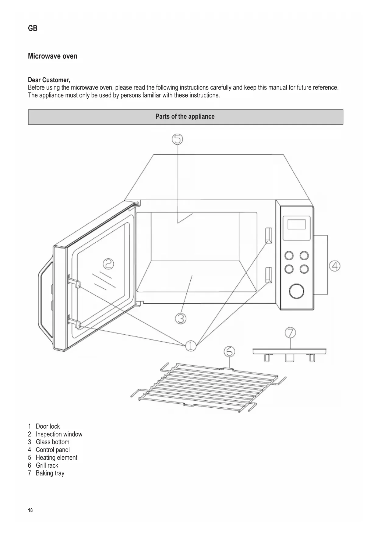 Caution: The exterior surfaces of the appliance may become hot during operation. There is also a danger of steam being emitted through the ventilation slots, with a consequent risk of scalding. ∙ Let the appliance cool down sufciently before it is transported. ∙ Neither the housing nor the connecting cable must come close to a hot cooking plate or open ames. Do not let the connecting cable hang down and keep it away from hot appliance parts.23 142 x 208 mm ∙ If the appliance is not kept clean and food residues are not removed, this can lead to a deterioration of the surface quality, which in turn can affect the service life of the appliance and possibly pose a danger to the user. After each use, clean the door seals, the cooking chamber with the glass bottom and the adjacent parts with a damp cloth. Clean grill rack and baking tray in dishwater. More detailed information on cleaning and user maintenance can be found in the “Cleaning” section. ∙ This appliance is intended for domestic or similar applications, such as the - staff kitchens in shops, ofces and other similar working environments, - agricultural working environments, - by customers in hotels, motels etc. and similar accommodation, - in bed-and breakfast type environments. ∙ Caution: Any maintenance or repair work requiring the removal of any microwave radiation protection cover represents a serious hazard to unqualied persons. This includes the replacement of the special power cord or an interior light bulb. The unit must not be opened, except by qualied personnel. If repairs are needed, please contact our customer service department by telephone or email (see appendix). ∙ When heating liquids in your microwave oven, the liquid may heat up beyond boiling-point without visible evidence of bubbling. It is therefore important to exercise extreme caution when handling any containers, e.g. when removing them from the oven. ∙ Eggs in their shells or whole hard-boiled eggs must not be heated up in a microwave oven, since they may explode even after the microwave heating process has nished. ∙ Caution: It is also highly dangerous to heat up liquids or any kind of solid food items in closed containers in the unit, since there is a real danger of explosion. ∙ The contents of baby bottles or glass containers with baby food must be thoroughly stirred or shaken to ensure that the temperature is evenly distributed. Caution: To avoid painful and dangerous scalding, always check the temperature before feeding a child. ∙ When heating or cooking food contained or wrapped in combustible materials such as plastic or paper, there is a danger of those materials igniting. It is also possible that food will dry out or even ignite if the selected cooking time is excessive. Fat or oil are also inammable substances. It is therefore important to supervise the appliance during operation. Highly volatile or inammable liquids such as concentrated alcohol must of course not be heated up.24 142 x 208 mm ∙ Should any smoke be noticed during operation, keep the door closed to inhibit or smother any ames. Switch the unit off immediately and remove the plug from the wall socket. ∙ To prevent danger of burns, a suitable oven-cloth must always be used when removing food items from the oven, since the utensils and cooking containers heat up not only during use of the grill or hot-air functions, but also during microwave operation. ∙ Special food thermometers (as used in conventional baking ovens) are not suitable for use with microwave ovens. Beforeusingforthersttime ∙ After unpacking and every time before connecting the unit to the power supply, check the unit and its power cord carefully for any signs of damage. ∙ Caution: Ensure that the door, including the inspection window, door seals and locks, are not damaged or bent and that it closes rmly against the support. This is important to ensure that no microwave energy is allowed to escape during operation. For the same reason, the entire casing as well as the inside of the oven must be carefully checked. Should the unit show any signs of damage, it must not be used under any circumstances until it has been repaired by a qualied technician. ∙ Remove any exterior and interior packaging materials, and any promotional or other stickers found. All these materials are suitable for recycling. ∙ Caution: Do not remove the rubber plugs from the grill rack. ∙ Do not remove the protective lm covering the inside of the door. ∙ Caution: Keep any packaging materials well away from children – such materials are a potential source of danger, e.g. of suffocation. ∙ Before the appliance is used for the rst time, or after extended periods of non-use, it should be thoroughly cleaned as described in the section Cleaning. ∙ Before the microwave appliance is used for the rst time, let it heat up on the grill setting (without the microwave function activated) for approximately 10 minutes. This will remove the smell typically encountered when rst switching on a grill. A little smoke may be emitted; this is quite normal, but ensure there is sufcient ventilation. ∙ Note: Do not switch the unit on unless the food to be heated or cooked has been placed inside the oven. Operating the appliance empty could result in damage to the unit. IMS device This appliance is a group 2 class B ISM device. Group 2 contains all ISM devices (industrial, scientic, medical) generating radio frequency energy and/or using radio frequency energy in the form of electro-magnetic radiation to process materials; it also comprises spark erosion devices. Class B species devices designed for domestic use, or any similar devices integrated in the general power grid supplying domestic units. The microwave function (Group II in compliance with EN 55011) Electromagnetic energy is generated inside the unit, causing the molecules in the food (mainly water molecules) to oscillate and subsequently causing the food to become hot. F