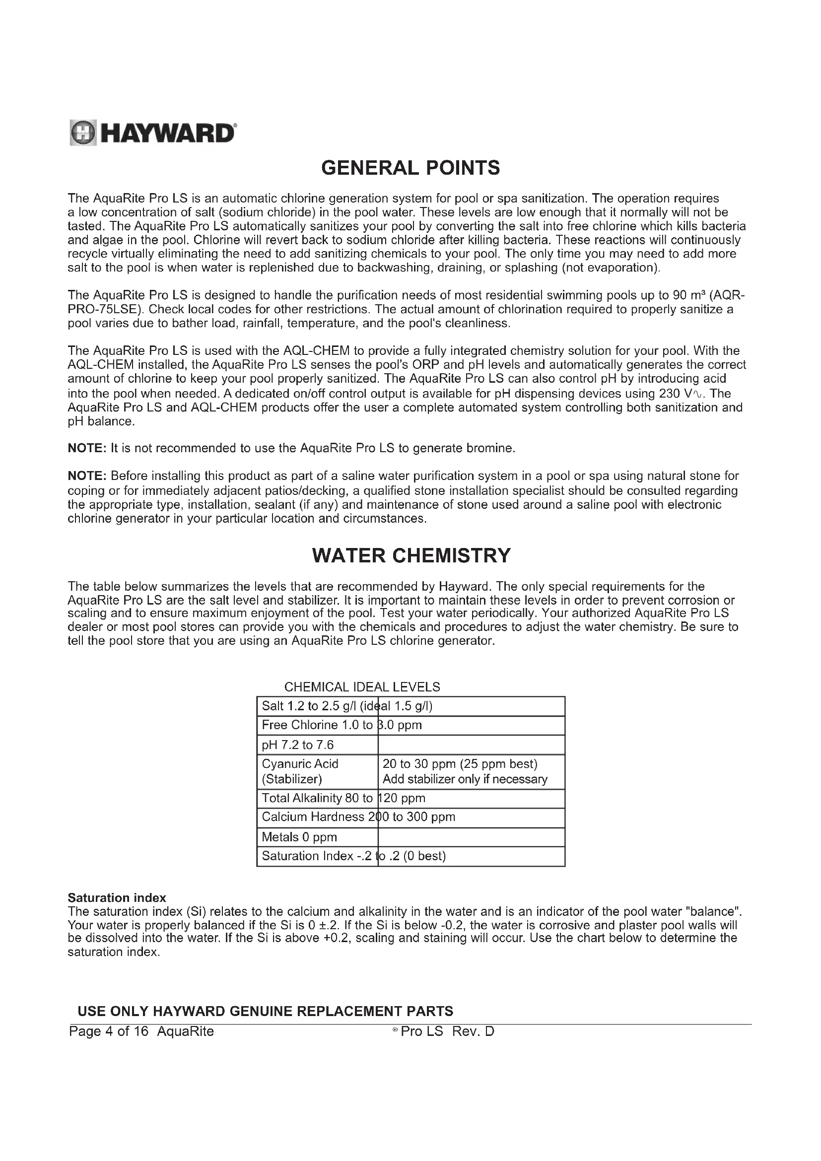 Salt 1.2 to 2.5 g/l (ideal 1.5 g/l) Free Chlorine 1.0 to 3.0 ppm pH 7.2 to 7.6 Cyanuric Acid (Stabilizer) 20 to 30 ppm (25 ppm best) Add stabilizer only if necessary Total Alkalinity 80 to 120 ppm Calcium Hardness 200 to 300 ppm Metals 0 ppm Saturation Index -.2 to .2 (0 best) Saturation index The saturation index (Si) relates to the calcium and alkalinity in the water and is an indicator of the pool water "balance". Your water is properly balanced if the Si is 0 ±.2. If the Si is below -0.2, the water is corrosive and plaster pool walls will be dissolved into the water. If the Si is above +0.2, scaling and staining will occur. Use the chart below to determine the saturation index.USE ONLY HAYWARD GENUINE REPLACEMENT PARTS Page 5 of 16 AquaRite
