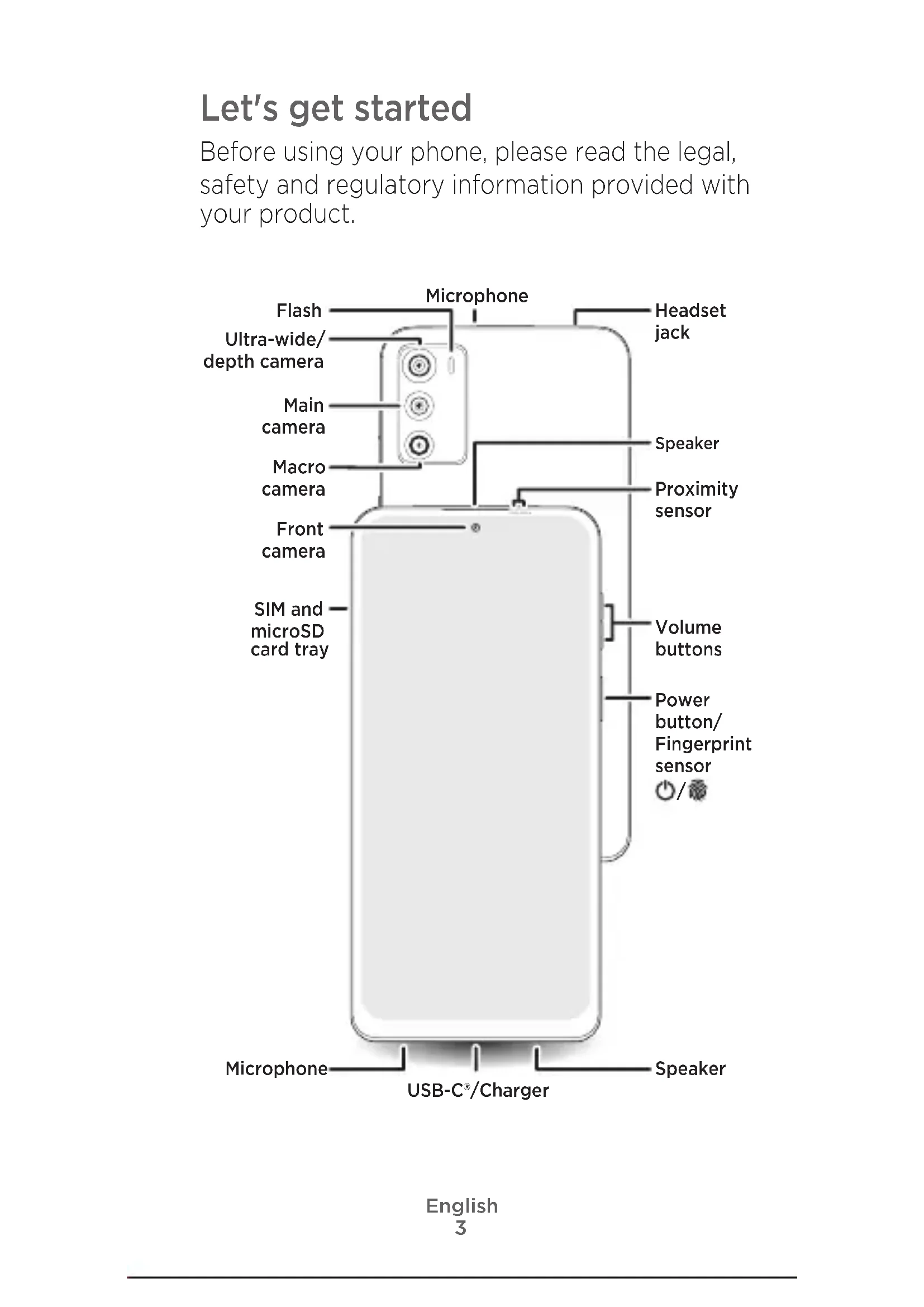 Microphone Speaker Main camera Ultra-wide/ depth camera Flash Front camera SIM and microSD card tray Macro camera English4 Put in the cards and power on Nano SIM 1 Insert the SIM tool into the hole next to the tray to pop out the tray. Make sure you use the correct size SIM card and don't cut the SIM card. SIM SIM1 SIM2 One-SIM model Two-SIM model 2 Insert the SIM card(s) with the gold contacts down, then gently push the tray into the slot. Add a microSD card (optional, sold separately) for additional storage. 3 Press and hold the Power button, then follow the prompts to get started.5 Help and more Get answers, updates and info: