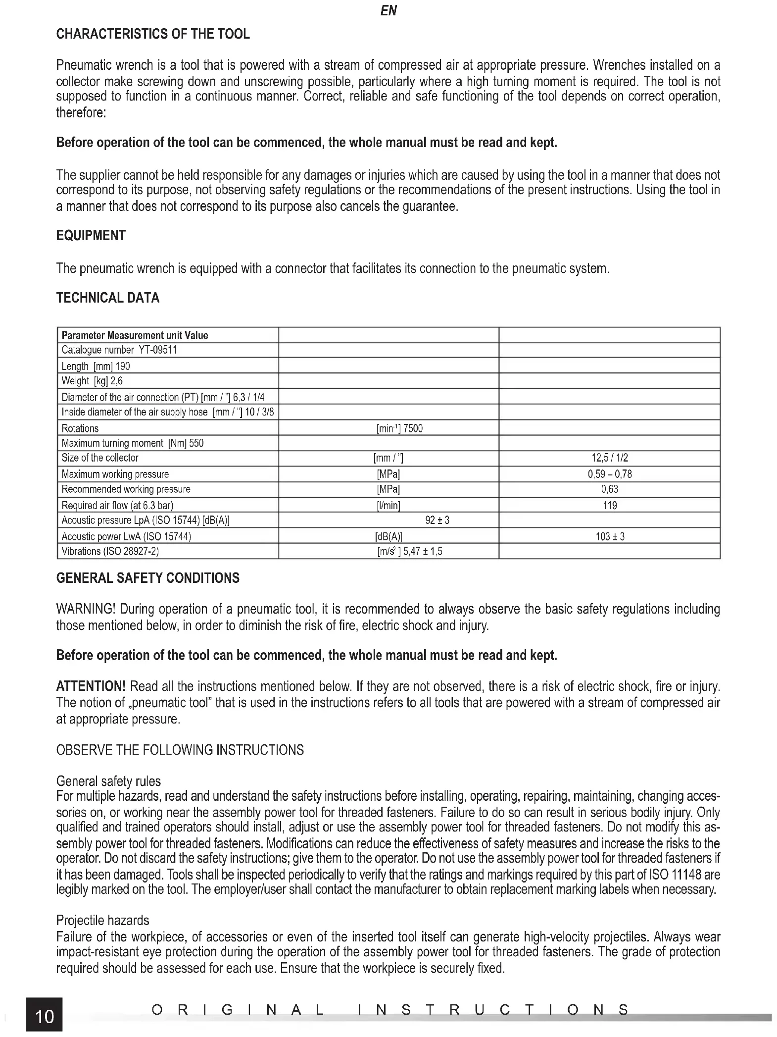 Pneumatic wrench is a tool that is powered with a stream of compressed air at appropriate pressure. Wrenches installed on a collector make screwing down and unscrewing possible, particularly where a high turning moment is required. The tool is not supposed to function in a continuous manner. Correct, reliable and safe functioning of the tool depends on correct operation, therefore: Before operation of the tool can be commenced, the whole manual must be read and kept. The supplier cannot be held responsible for any damages or injuries which are caused by using the tool in a manner that does not correspond to its purpose, not observing safety regulations or the recommendations of the present instructions. Using the tool in a manner that does not correspond to its purpose also cancels the guarantee. EQUIPMENT The pneumatic wrench is equipped with a connector that facilitates its connection to the pneumatic system. TECHNICAL DATA Parameter Measurement unit Value Catalogue number YT-09511 Length [mm] 190 Weight [kg] 2,6 Diameter of the air connection (PT) [mm / ”] 6,3 / 1/4 Inside diameter of the air supply hose [mm / ”] 10 / 3/8 Rotations [min