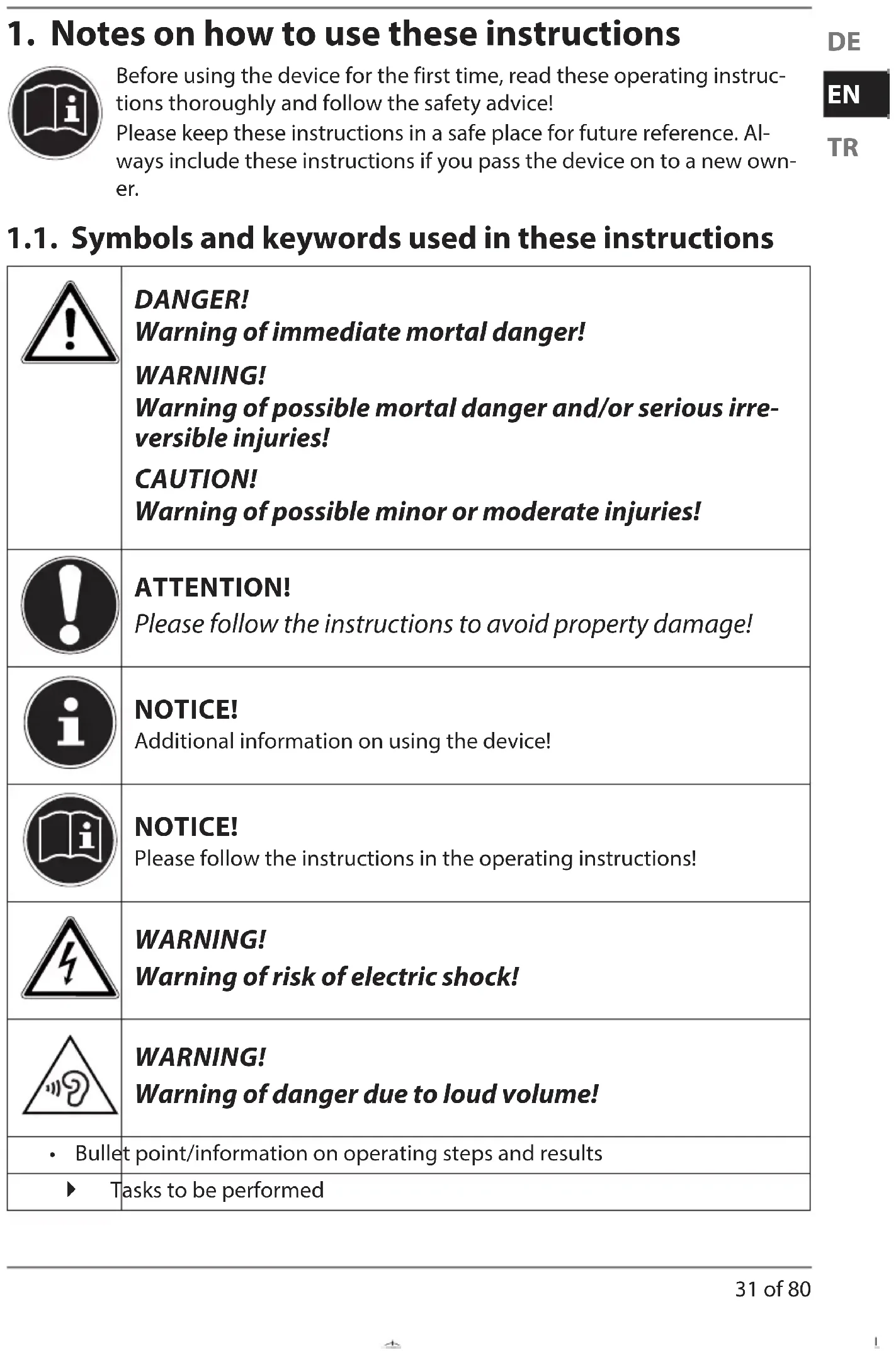 Before using the device for the first time, read these operating instruc- tions thoroughly and follow the safety advice! Please keep these instructions in a safe place for future reference. Al- ways include these instructions if you pass the device on to a new own- er. 1.1. Symbols and keywords used in these instructions DANGER! Warning of immediate mortal danger! WARNING! Warning of possible mortal danger and/or serious irre- versible injuries! CAUTION! Warning of possible minor or moderate injuries! ATTENTION! Please follow the instructions to avoid property damage! NOTICE! Additional information on using the device! NOTICE! Please follow the instructions in the operating instructions! WARNING! Warning of risk of electric shock! WARNING! Warning of danger due to loud volume!