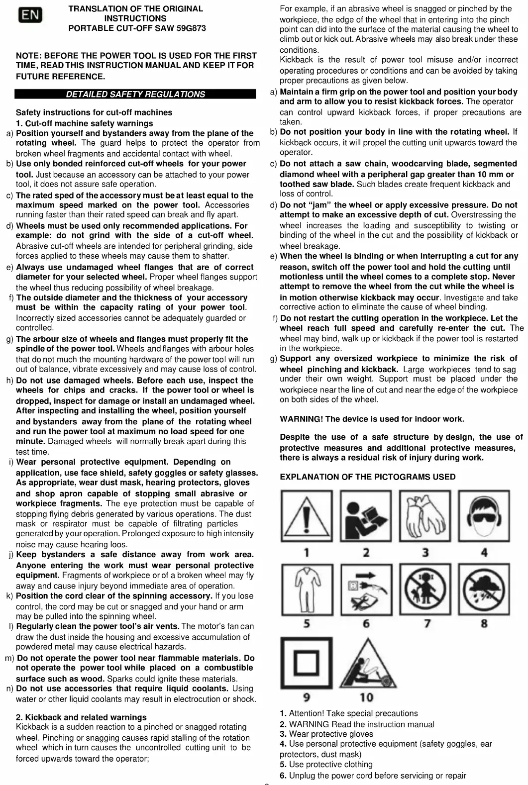 Kickback is a sudden reaction to a pinched or snagged rotating wheel. Pinching or snagging causes rapid stalling of the rotation wheel which in turn causes the uncontrolled cutting unit to be forced upwards toward the operator; For example, if an abrasive wheel is snagged or pinched by the workpiece, the edge of the wheel that in entering into the pinch point can did into the surface of the material causing the wheel to climb out or kick out. Abrasive wheels may also break under these conditions. Kickback is the result of power tool misuse and/or incorrect operating procedures or conditions and can be avoided by taking proper precautions as given below. a) Maintain a firm grip on the power tool and position your body and arm to allow you to resist kickback forces. The operator can control upward kickback forces, if proper precautions are taken. b) Do not position your body in line with the rotating wheel. If kickback occurs, it will propel the cutting unit upwards toward the operator. c) Do not attach a saw chain, woodcarving blade, segmented diamond wheel with a peripheral gap greater than 10 mm or toothed saw blade. Such blades create frequent kickback and loss of control. d) Do not “jam” the wheel or apply excessive pressure. Do not attempt to make an excessive depth of cut. Overstressing the wheel increases the loading and susceptibility to twisting or binding of the wheel in the cut and the possibility of kickback or wheel breakage. e) When the wheel is binding or when interrupting a cut for any reason, switch off the power tool and hold the cutting until motionless until the wheel comes to a complete stop. Never attempt to remove the wheel from the cut while the wheel is in motion otherwise kickback may occur. Investigate and take corrective action to eliminate the cause of wheel binding. f) Do not restart the cutting operation in the workpiece. Let the wheel reach full speed and carefully re-enter the cut. The wheel may bind, walk up or kickback if the power tool is restarted in the workpiece. g) Support any oversized workpiece to minimize the risk of wheel pinching and kickback. Large workpieces tend to sag under their own weight. Support must be placed under the workpiece near the line of cut and near the edge of the workpiece on both sides of the wheel. WARNING! The device is used for indoor work. Despite the use of a safe structure by design, the use of protective measures and additional protective measures, there is always a residual risk of injury during work.